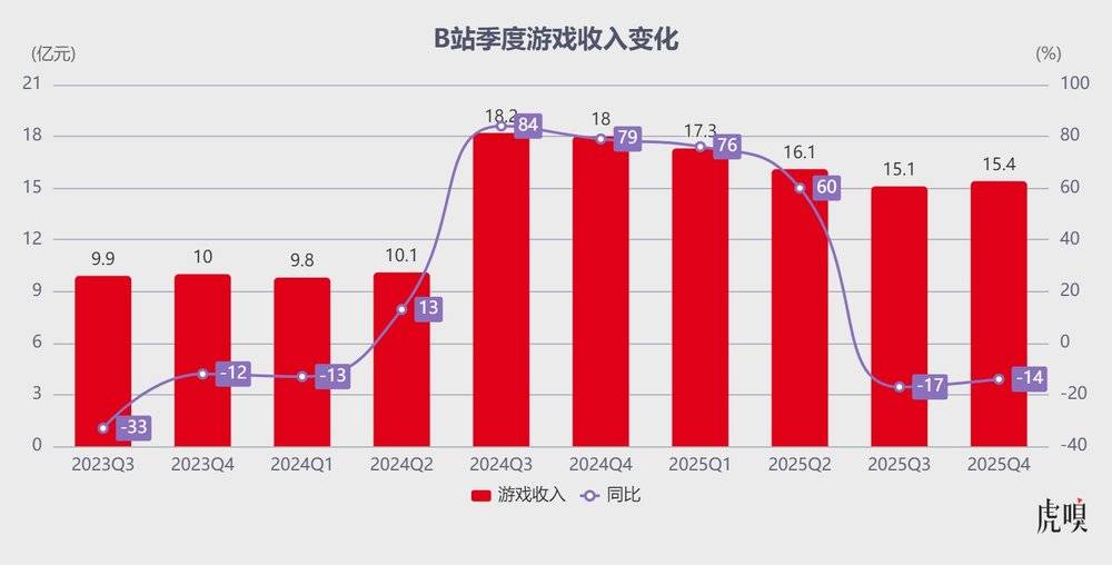 不过,2025年B站游戏收入却呈逐渐下滑的态势:从一季度的17.31亿元,降至二季度的16.1亿元、三季度的15.1亿元,第四季度微增至15.4亿元,增长动能明显减弱。