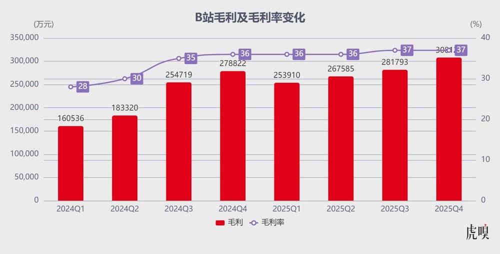 单季度来看,2025Q4B站总营收83.2亿元,同比增长8%;净利润5.1亿元,同比大幅提升478%;毛利率连续14个季度环比提升至37%,调整后运营利润率升至10%,稳步向15%-20%的中期目标迈进。