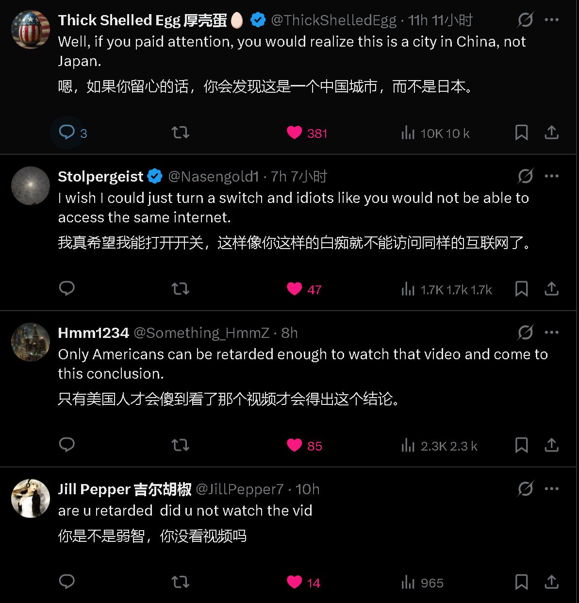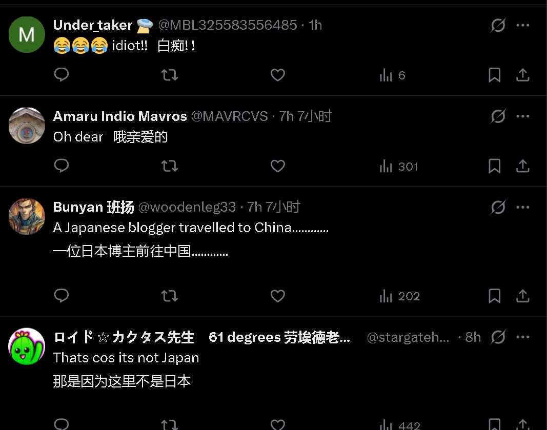 笑死,全世界人民都非常厌蠢,而且嘴都很毒。 有人发了个“一位日本博主前往中国,旨在揭穿有关中国未来主义、赛博朋克风格城市真实性的说法”的帖子。 一个黑人女士评论说:我去过日本,不是这样的,我不相信互联网。 瞬间引起群嘲。