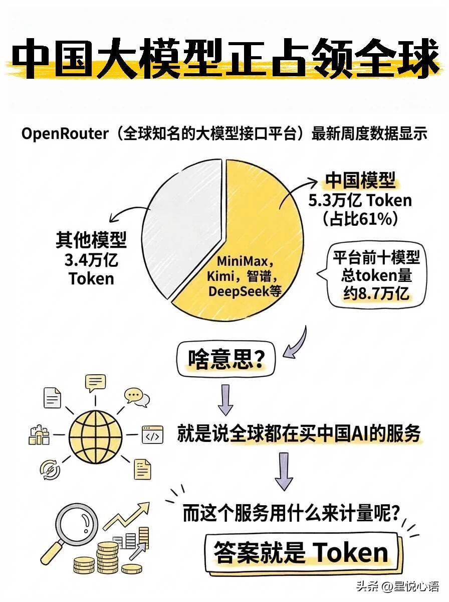 大白话看懂AI大模型里的Token是个啥? 中国大模型太牛了!直接拿下全球61%的Token份额,这波数字出口真的扬眉吐气! 还不懂Token是啥? 说白了就是AI界的字数流量计。 像手机算流量、电表算度数一样, AI聊天、生成内容,全靠Token计数。 算提问和回答的字数,定收费标准,还能限制对话长度,核心得很! 企业靠Token赚钱超简单,要么API按量计费,用多少收多少,国内价格还超亲民,国外用户使用价格是国内的上百倍。 要么做订阅服务,付月费年费就能畅用,稳定又省心。 Token背后藏着大生意,耗算力又烧电力,直接带火AI芯片、服务器、智能电网这些行业。 更绝的是中国电力借Token跨境变现,数据跨国跑,电力价值跟着走,妥妥的数字出口新玩法! 中国AI这波弯道超车,真的太让人骄傲了! Ai未来真的是无限可能,中国大力发展电力,为未来Ai发展奠定了基础。小伙伴们怎么看呢?