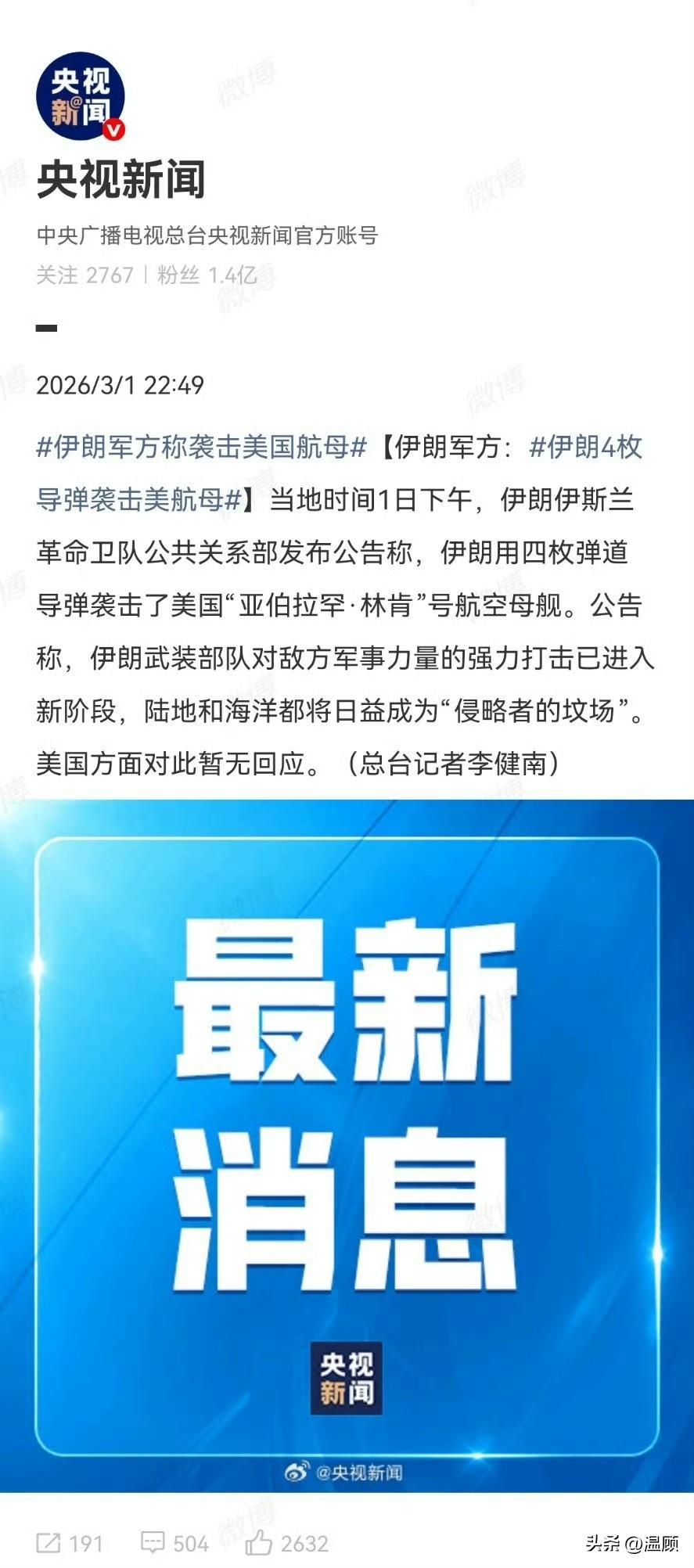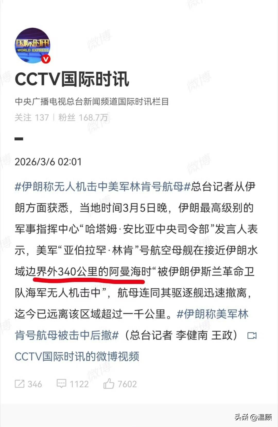 截至目前,伊朗方面已三次宣称对部署在北阿拉伯海的林肯号航母(CVN-72)发动攻击:使用4枚弹道导弹、4枚巡航导弹,以及无人机实施打击,并表示无人机成功击中林肯号。 但至今没有任何现场打击画面、残骸、卫星图等实证,这类消息基本可以判定为信息战,应是弱势一方鼓舞己方士气、扰乱敌方判断的常用手段。 美军航母编队拥有多层严密防御体系: 最外围是E-2D预警机,中层是阿利·伯克级驱逐舰的宙斯盾系统,内层还有航母自身近防系统,层层拦截。 伊朗无人机速度存在明显短板: - 最快自杀无人机哈迪德-110:约500公里/小时 - 主力见证者-136:仅约180公里/小时 即便从340公里外发射哈迪德-110,美军也有约40分钟反应时间。 想单靠无人机突破战时状态下林肯号的多层防御并成功命中航母,可能性无限接近于0。 真正具备威胁的,只有一种战术: 多类型无人机蜂群+弹道导弹+巡航导弹,高中低空同步饱和攻击,再配合无人艇、无人潜航器协同作战,才有可能对美军航母构成实际威胁。