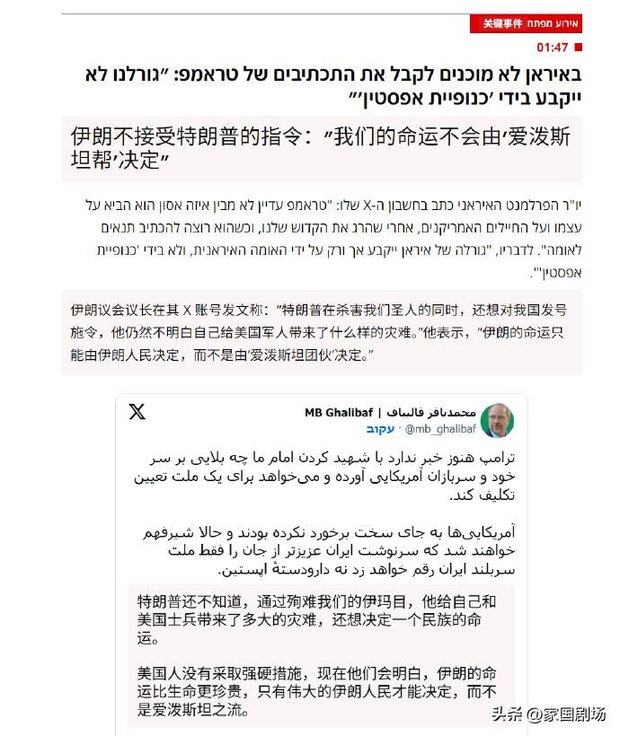 🔻特朗普对 12 频道新闻表示:“我要求伊朗无条件投降。” 🔻一位与 N12 交谈的美国高级官员描述道:“战争的第二阶段已经开始,预计将持续 12 到 14 天。” 🔻伊朗议会议长的回应是:“特朗普在杀害我们圣人的同时,还想对我国发号施令,他仍然不明白自己给美国军人带来了什么样的灾难。伊朗的命运只能由伊朗人民决定,而不是由‘爱泼斯坦团伙’决定。”