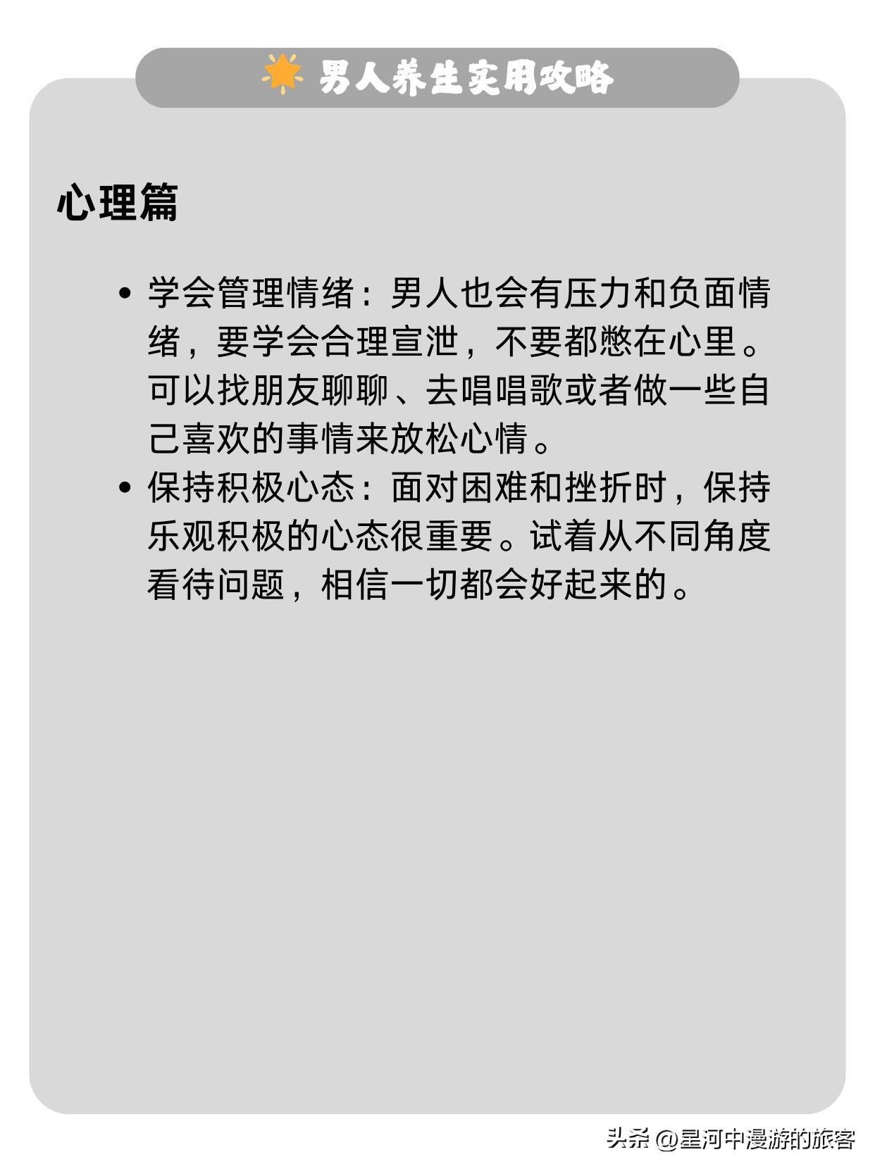老爷们儿别再硬扛了!这5件事比啥补药都顶用 现在的老爷们儿,天天被那句“男人必须硬气”给绑得死死的,其实啥补药都不如把这5件小事儿整明白,比吃啥都管用。 别天天顿顿点外卖糊弄自己,有空学着鼓捣俩家常菜,荤素搭配着吃,吃到七八分饱就停嘴,规律吃饭比啥保健品都养人。 别天天熬夜硬扛,到点就往床上躺,每天睡够7到9个小时,身体修复、免疫力上来,全靠夜里这顿“充电”。 心里有压力别自己憋着,找个信得过的人唠唠,或者写下来也行,每周去公园溜达溜达,出出汗跑跑跳跳,身体里分泌的内啡肽,专治各种闹心焦虑。 有点头疼脑热别死撑着,感冒发烧赶紧去看,别拖着拖成老毛病,身子骨才是你扛事儿的根本。 最后说一句,学会服软不叫窝囊,有人关心、敢说心里话、敢承认自己需要帮忙,才算真正卸下“硬汉”那套枷锁。先把自己照顾好,才有底气扛家里外头的事儿。中年不拼三样 中年别硬扛 中年男人的拼搏 男人十大爱好 男人大病扛 爷们硬实力 中年男人抗衰