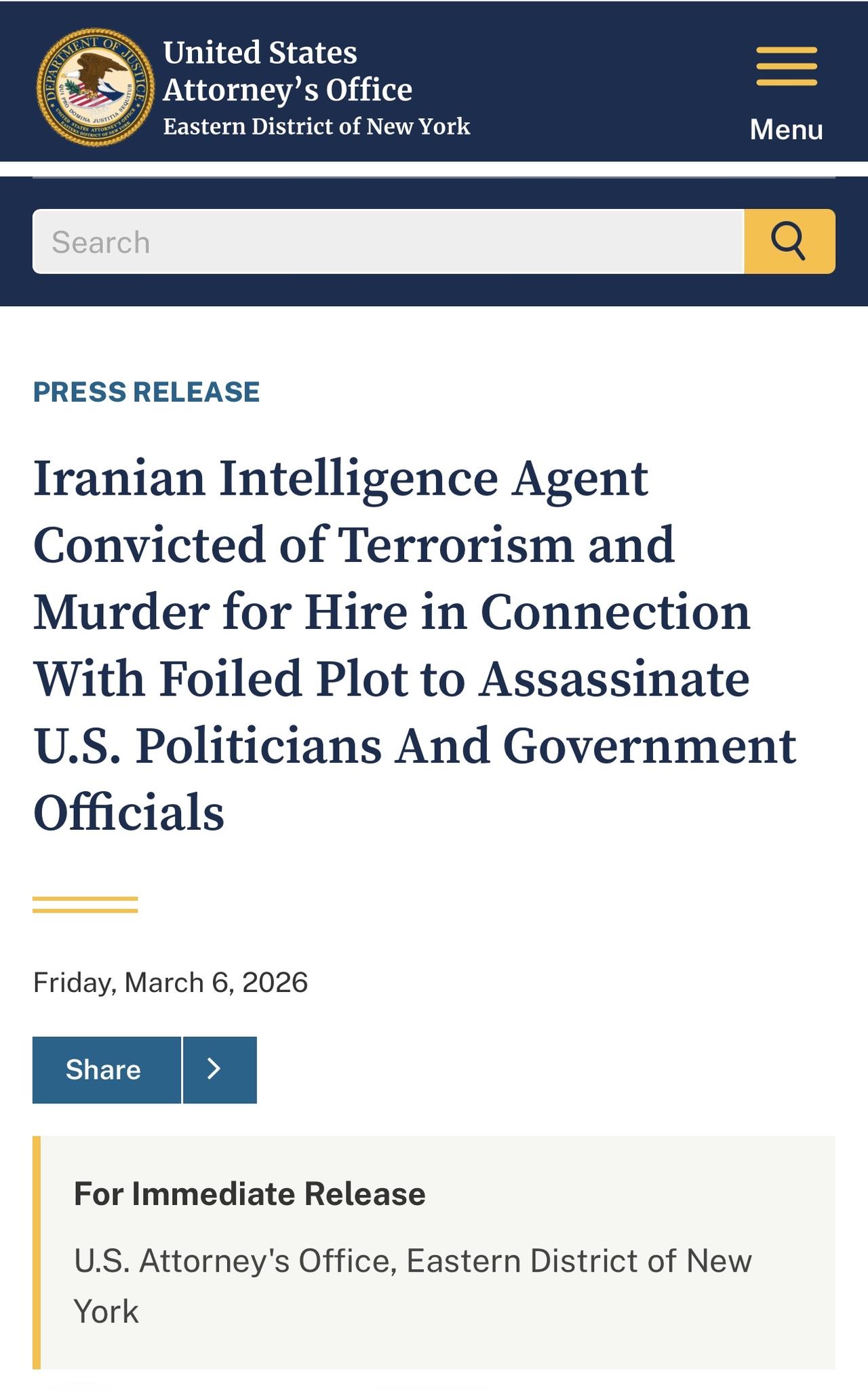 调查人员说:经过 FBI 纽约联合反恐特遣队和@EDNYnews的调查,伊朗情报人员阿西夫·默钱特被判犯有雇凶杀人和企图实施跨国恐怖主义行为罪。