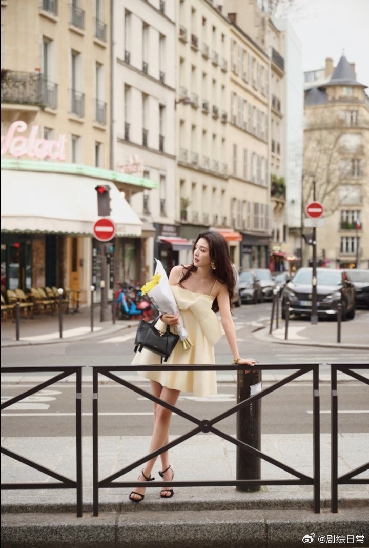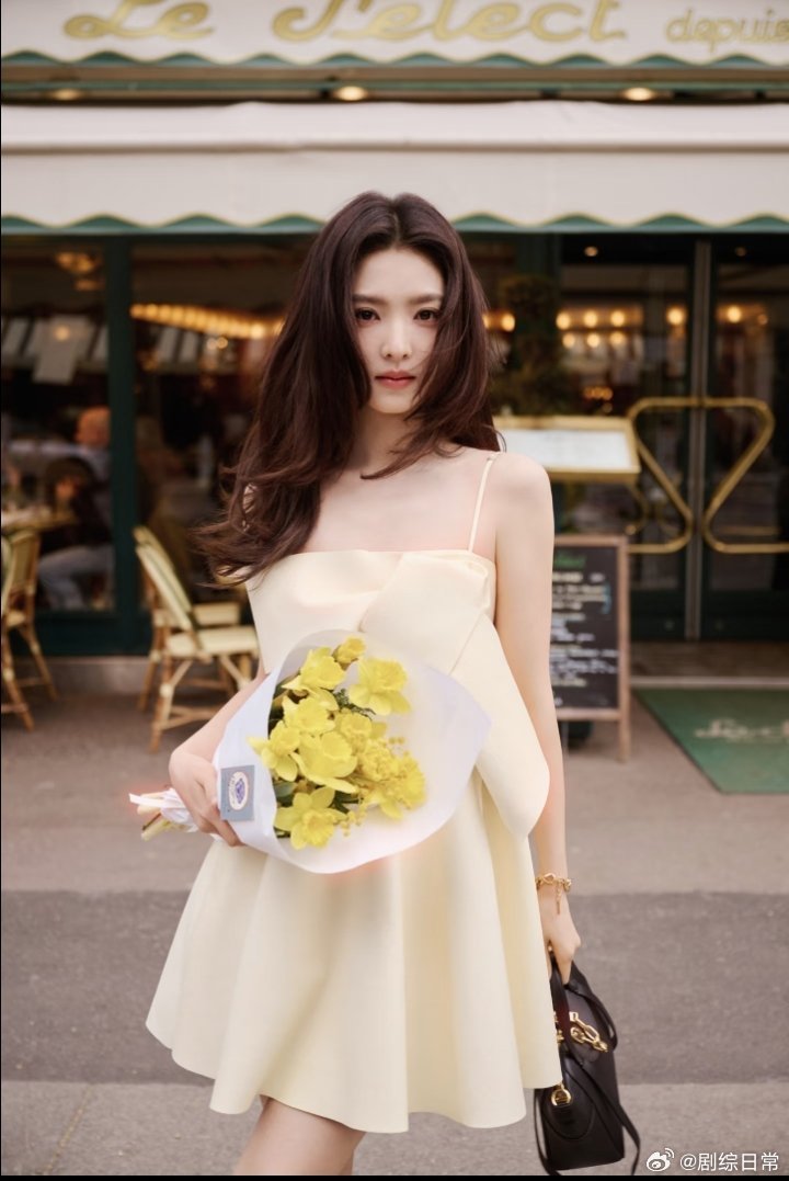 章若楠黄色蝴蝶结吊带裙淡黄长裙,超大蝴蝶结,章若楠往那儿一站,巴黎的春天就来了。