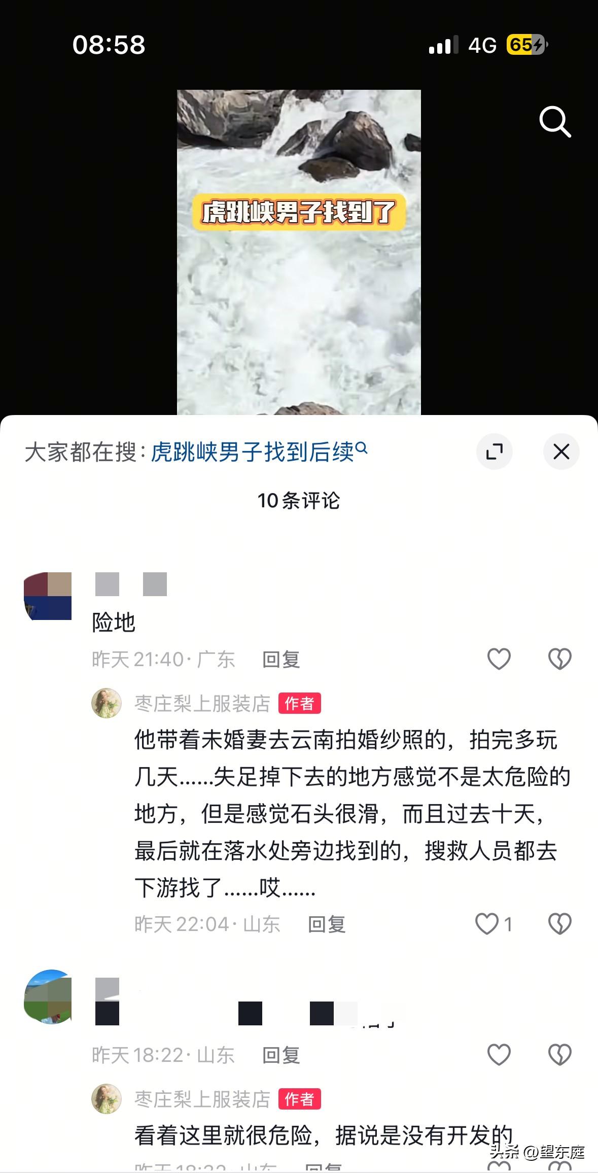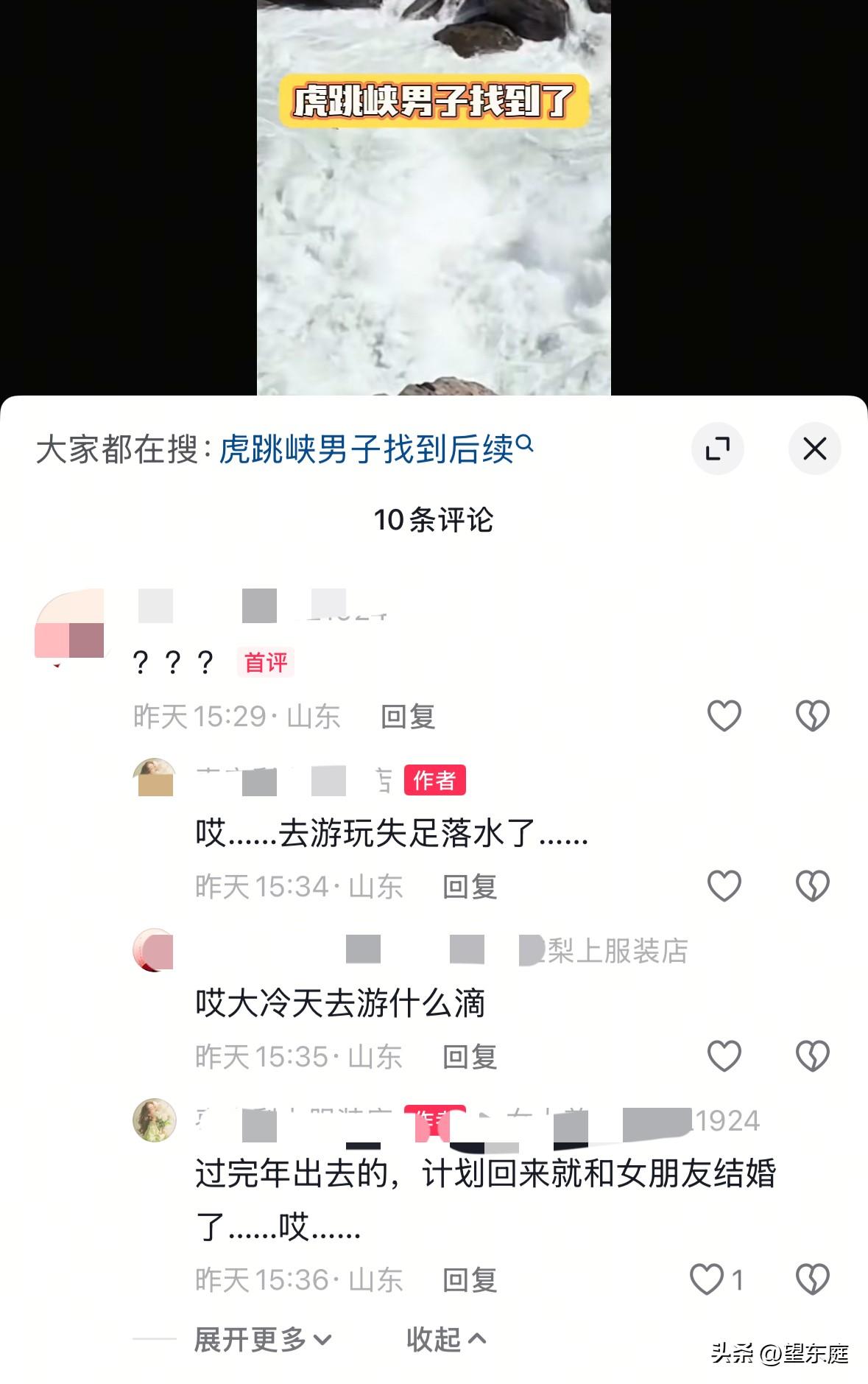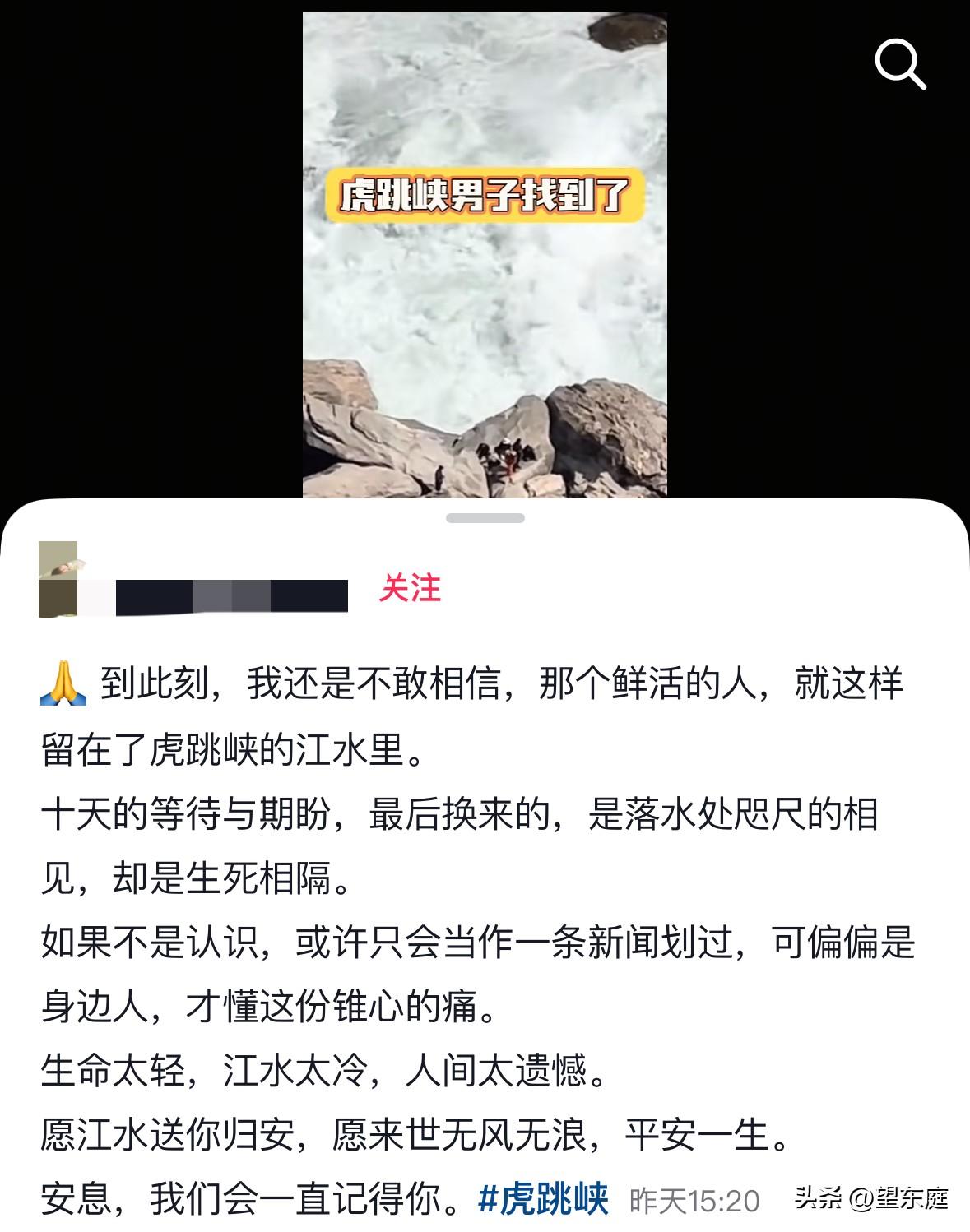 悲痛!在虎跳峡落水的29岁男子遗体被找到了!他是山东枣庄人,之所以去云南是和女友过去拍婚纱照的。拍完后,他们又多留了几天,想趁着假期好好游览一下云南的大好河山! 这个男子名叫小杜,他出生1997年。在这个新年里,快要奔三的他终于迎来了属于自己的人生大事: 他和女友已经约定好了,会在2026年结婚。于是在这个新春假期里,他们一起开开心心的去了心仪的云南。 可没想到,一场意外让所有人始料不及。 悲剧发生在2月25日。 当天一早,小杜和女友一起从丽江古城出发来到了位于迪庆的中虎跳峡。 一路上,二人有说有笑,彼此都给各自拍下了许多精彩的照片。 下午,二人徒步前往到了“发疯石”这一处位置。下午3点45分左右,小杜不慎落水。 事实上,女友发现小杜落水后,曾尝试用手里的登山杖来施救。只可惜江水太过汹涌,根本来不及。很快,小杜整个人就被急流吞没了。自此,一个年轻的山东大汉便彻底失去了踪影…… 悲剧发生后,多支救援队伍一直在小杜落水处的下游开启搜救行动! 众所周知,金沙江虎跳峡段是以深、险、奇、绝、秀”而闻名的,它不比其他水域,要想在激流回旋的江水里找个人,绝非易事。 以至于一连多天,事情都没有进展。 2026年3月6日,小杜终于被找到了。彼时,距离他落水失踪已经过去了10天时间。 小杜的遗体就在落水处不远的一段水域,他被卡在离水面5米处的石缝里。由于那个位置打捞难度较大,需要一个人下水去处理才行,目前还在想办法进行打捞。 在这个事情背后,一些细节让人无比揪心! 有知情人透露了小杜落水的原因:当时小杜因为杯子沾了些泥巴,于是站弯腰伸手去洗。结果,不慎落水。 一个鲜活的年轻人,就这样失去了生命,实在是太让人痛心了! 明明他都已经快要结婚了,明明所有亲朋好友都在等着喝喜酒了。他和女友婚纱照都已经拍好了,不料,他这个准新郎却出了事。 通过这个悲剧,希望大家凡事都要多加注意!出门游玩,安全第一,不管什么时候,务必小心谨慎。 在此,愿小杜一路走好,愿他的家人节哀顺变,化悲痛为力量,好好生活下去![祈祷][祈祷][祈祷][祈祷]