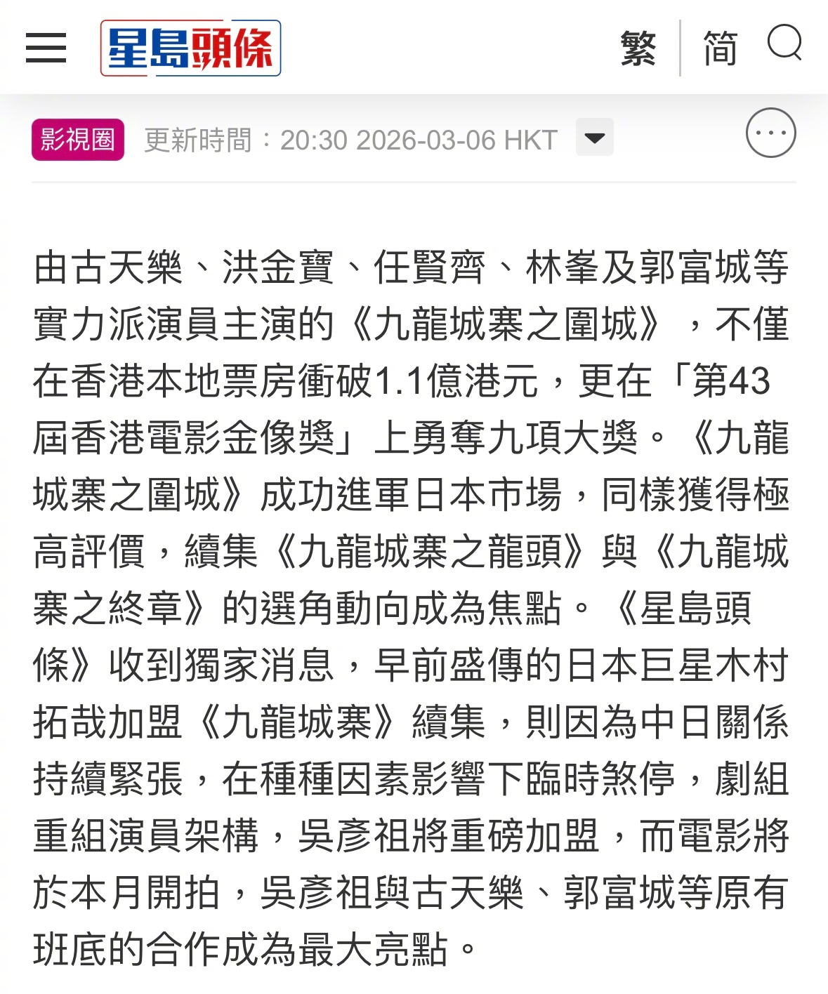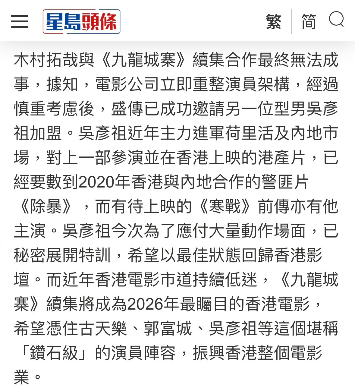 吴彦祖将加盟九龙城寨续集 据《星岛头条》报道,《九龙城寨》续集将于本月开拍,此前盛传的木村拓哉加盟因种种原因临时煞停,剧组重组演员架构,吴彦祖将重磅加盟,合作古天乐、郭富城等原有班底。为了应付大量动作场面,吴彦祖已秘密展开特训。
