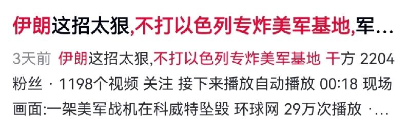 绝杀!伊朗不打以色列,专炸美军基地!一招废掉美国中东霸权 伊朗真正吃透了东方智慧,打出最狠的一招:不打棋子,直捣王座! 美国能在中东横行,全靠环伊朗密布的军事基地网——雷达、战机、指挥中枢、油库弹药,全是霸权命脉。伊朗放弃轰炸以色列,集中火力摧毁美军核心基地:卡塔尔乌代德空军基地瘫痪、巴林第五舰队总部被炸、多国基地沦为废墟。 基地一毁,美军瞬间变瞎子、瘸子、哑巴,航母仓皇后撤千里,海空优势彻底清零。这不是对抗,是降维打击、断脊绝杀! 伊朗直接把幕后黑手美国拖进战场,打碎其“隔岸观火”的美梦。美国中东盟友彻底惊醒:驻军不是护身符,是催命符!霸权联盟一夜崩塌。 这一战,伊朗砸碎美国霸权枷锁,世界格局彻底改写!美国一手遮天的时代,结束了! 对此,你怎么看? 伊朗 美军基地 中东局势 终结美国霸权