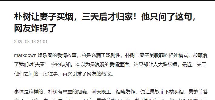 2006年,朴树让妻子吴晓敏下楼买包烟。左等右等不见人回来,他没打电话,直接睡觉去了。三天后,吴晓敏拿着烟回来,朴树若无其事接过,没有过问这三天去了哪。   想知道婚姻到底还能松弛成什么样,这对夫妻绝对让你大开眼界:离谱、平静、真实,却又那么令人向往。想明白信任本质的,务必看到最后。   先简要还原一下当年的情节。零六年,朴树像普通丈夫一样让吴晓敏下楼买包烟。   然后,吴晓敏就消失在了北京的风雪里——手机不通,位置不明,整整三天无消息。   换成普通夫妻,这估计已经找疯、报警加撕破脸皮了。   朴树却很冷静,正经吃饭睡觉、工作照常,一个电话都没打出去,没质问没发脾气。   吴晓敏三天后如常归家,手里还真提着那包烟。   朴树面不改色——烟接过来,啥都没追问,甚至连一个表情波动都没有。   只一句“她会回来的”送给全天下八卦媒体和惊掉下巴的网友们。   这段“离谱”到极致的信任,成了无数人讨论婚姻最极端的案例。   不管在豆瓣小组还是知乎热门,关键都在于,这对夫妻的纽带是“绝对信任”——连人生安全都几乎交出控权,和传统观念里“凡事都要汇报”的婚姻状态完全反差。   许多中国网友讨论到这里时,会觉得匪夷所思,但如果细看他们一路走来的选择,其实一切都有迹可循。   说起这对夫妻,可能很多人觉得朴树有点文艺男神那一挂,但其实他的婚姻观比歌词还要松弛得多。   两个人的结婚现场,要不要婚纱、仪式、钻戒?   这些问题对他们根本不成立。他们的结婚日选在了北京的一个下雪天。   伴随全国最低气温,两人在民政局门口简单登记。   没有白纱、没有鲜花、没有任何亲友团,甚至连戒指和照片都省。   领了证,转头就是一碗路边炸酱面,各自拎包回家,第二天还得赶着上班。   蜜月、庆祝这种现代婚礼的标配,对他们来说似乎完全没必要。   没有铺张,也没有“仪式感”,而是认为舒服、自在、顺其自然才是最理想的状态。   朴树很坚定,婚姻不是做给别人看的表演秀,不愿把感情变成需要动脑经营和不停俯就的绩效任务。   而吴晓敏恰好理解且认同,并不觉得缺少这些外在形式会影响什么。   两个人都认为,过舒服的小日子,才是长期相伴的最大前提。   再回头聊聊他们的性格和缘分。朴树和吴晓敏其实是从朋友聚会认识的。   零一年春天,吴晓敏刚刚踏进娱乐圈时,朴树因为《生如夏花》已然在华语乐坛站稳脚跟。   本来两人的性格属于南辕北辙:朴树自认沉默寡言,很排斥社交,典型的理科男出身——家里学术氛围浓厚,爸妈都希望他安安稳稳走学霸路线,可他偏要“离经叛道”地选择音乐;从小就很有主见但也格外敏感脆弱。   吴晓敏完全相反,性格爽朗外向,适应力特别强,能游刃有余应对各种酒局饭局和应酬,把人际关系理得明明白白。   但这对“反差萌”背后,恰恰有着一个关键的共鸣点,那就是“自由”。   说到底,两人都不喜欢被其他人定义。   吴晓敏看上去顺风随性,却绝不去试图改造谁,也不愿被对方牵着鼻子走;而朴树更是极度抗拒“被规范”“被管束”,从骨子里信奉“独立人格至上”,家庭外界谁管也不服。   所以表面再分歧再不贴合,唯独在“不要束缚”的共同追求上,成了很深的联结。   很多人觉得婚姻要靠磨合,互相迁就才会长久,其实有些人就是恰恰需要彼此留白和空间。   这也是为什么他们能够达成那种看似悬在空中却从不坍塌的默契,外人看着不可思议,自己却过得云淡风轻。   这种自由体现在点滴生活中。   娱乐圈里多少明星结婚都要大操大办、恨不得把婚姻变成年度项目对外展示,每逢节日晒合照、周年纪念晒钻戒、孩子生日恨不得办成粉丝见面会秀恩爱。   但朴树和吴晓敏,两人基本从不高调谈论情感生活,哪怕在采访中被记者问到家庭,都只是轻描淡写。   朴树经常点到即止,私生活只留给小家庭自己。   在社交平台上你甚至找不到他们互发的信息,更不会看到双方互为“营业夫妻”的一面。   低调背后,是他们对于“婚姻”为何而存在的理解。   对比娱乐圈其他夫妻习惯性把感情公开、热衷于秀幸福这种普遍模式,他们选择了彻底反其道而行之,把婚姻视为成年人之间的契约,重要在于“存在”,不在于“占有”。   什么掌控、宣示、监督、报备,这些在他们关系中几乎是消失的。   彼此空间巨大,甚至能做到完全“不插手”对方日常,多数时间像两个各自独立的成年人,仅在关键时刻相互支撑。   一些网友会疑惑:这不怕关系变淡吗?但正是这种低调、避世的相处方式,让他们一直远离娱乐圈内外巨大的压力,无需向外人交出自己的私密生活,有属于两个人独特的小世界。 参考: 搜狐娱乐——朴树让妻子买烟,三天后才归家!他只问了这句,网友炸锅了