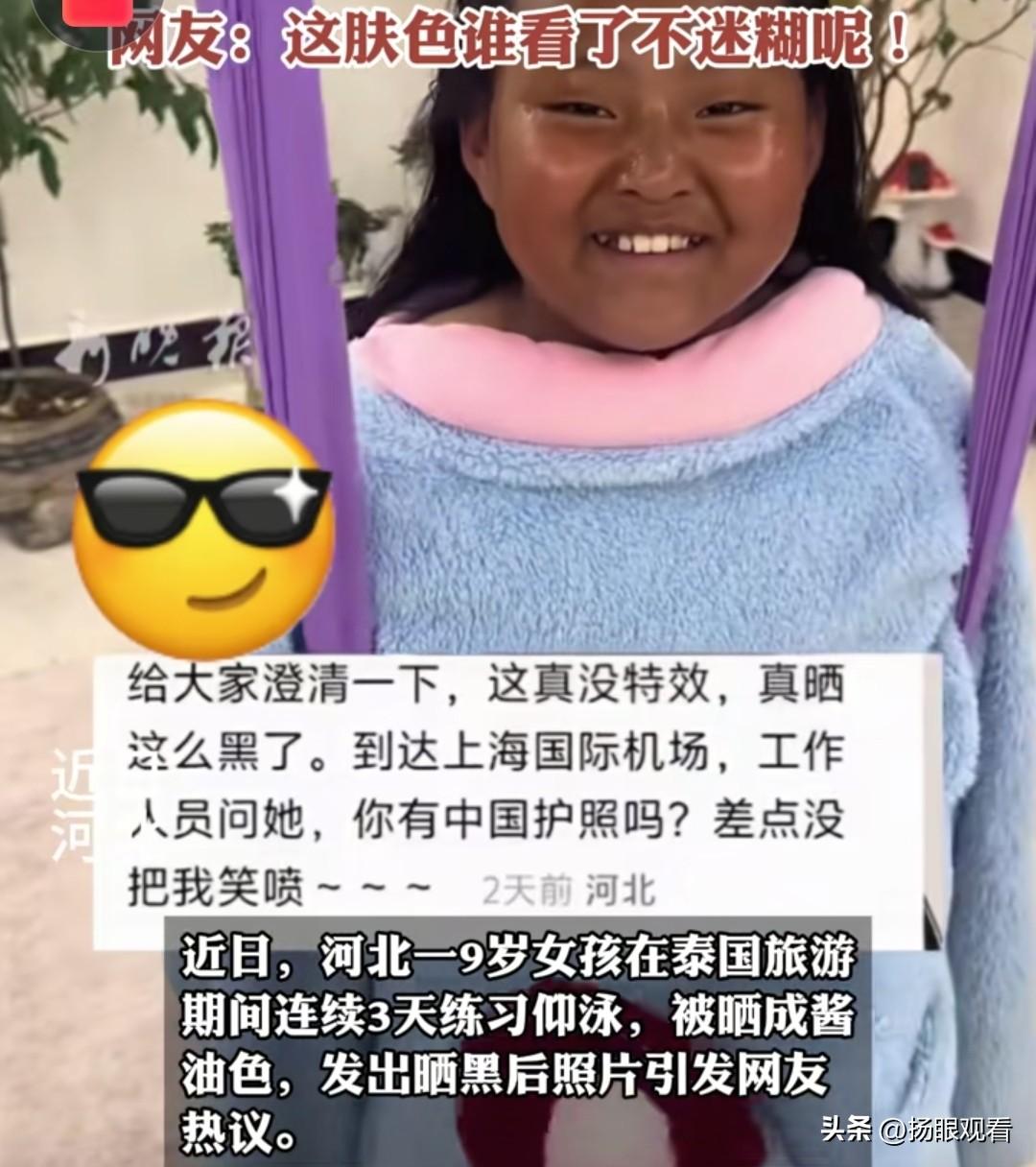 太好笑了!去泰国3天的娃直接晒成酱油色😂 近日河北9岁小女孩去泰国学仰泳,因为三天没停,直接晒成炭烤版🌚 回国过海关,在上海国际机场居然被工作人员灵魂拷问: 你有中国护照吗? 娃本人亲自辟谣: 真没滤镜!真没特效! 纯晒的!! 网友:这肤色,谁看了不迷糊啊哈哈哈哈 笑到我打鸣! 我认为泰国的太阳是真不讲情面![大笑]仰泳本来就脸朝天晒,3天连续暴晒,不涂防晒、不遮脸,黑得快太正常了,小朋友又贪玩,根本顾不上躲太阳。