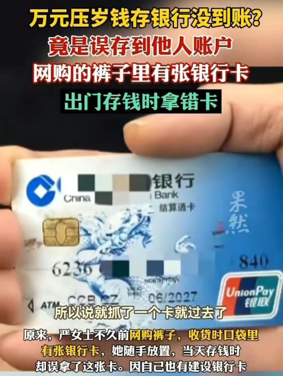 太不可思议了!武汉,女子拿着长辈给的11000元压岁钱去存,结果发现钱没有到账,后来才发现,之前网购了一条裤子,从口袋里摸出来一张银行卡,自己直接就扔在抽屉里,去存钱的时候,却误将这张卡带上了,因此,11000元钱存给了别人,最后,银行的经理陪着女子一起到派出所求助,几经周折才联系上了当初退货的李女士,她确实是在退货的时候,误将银行卡揣到了口袋,直接退货了。 最近武汉有位女士,存个压岁钱差点出大事,说起来都让人捏把汗,这位严女士是武汉江岸区百步亭社区的,过年期间收了长辈给的11000元压岁钱,想着存到银行卡里稳妥些,就揣着钱去了家附近的银行。 她填好存款单,签完字递给柜员,本以为钱很快就能到账,结果柜员核对的时候皱了眉,问她这张卡是不是她的,严女士当时就懵了,拿起银行卡仔细一看,瞬间反应过来,坏了,拿错卡了! 这张卡不是她的,那是哪来的呢?严女士仔细回忆,才想起大概两年前,她网购了一条裤子,收货的时候,从裤子口袋里摸出了这张银行卡,当时她还琢磨,应该是卖家退货的时候,不小心把卡落在口袋里了。 那天去存钱,她从抽屉里翻银行卡,没仔细看,就把这张陌生人的卡跟自己的卡混在一起拿了出来,到了银行也没核对,直接就递给了柜员,就这么把11000元压岁钱,存进了别人的账户里。 发现存错钱后,严女士急得直跺脚,手足无措,银行的经理知道情况后,也挺着急,赶紧陪着她去了附近的派出所求助,民警接到求助后,就根据银行提供的银行卡信息,开始帮忙联系卡主人。 几经周折,民警终于联系上了这张银行卡的主人,是远在河北任丘的李女士,电话接通的时候,李女士也是一头雾水,直到民警耐心解释完,她才恍然大悟,赶紧去查自己的账户,果然有一笔11000元的款项刚到账。 原来,李女士之前退货的时候,不小心把自己的银行卡揣进了那条裤子的口袋里,没来得及拿出来,就把裤子退了回去,最后这张卡就到了严女士手里。 弄清楚来龙去脉后,热心的李女士很快就和严女士互加了微信,通过手机操作,把这笔“迷路”的压岁钱一分不少地退了回来,严女士看着钱终于回来了,悬着的心才算彻底放下,一个劲地向银行经理和民警道谢。 其实这事也给大家提了个醒,不管是存钱还是放银行卡,都得细心点,尤其是银行卡这种重要的东西,一定要妥善保管,退货的时候也得多检查检查,别像李女士这样不小心落在商品里。