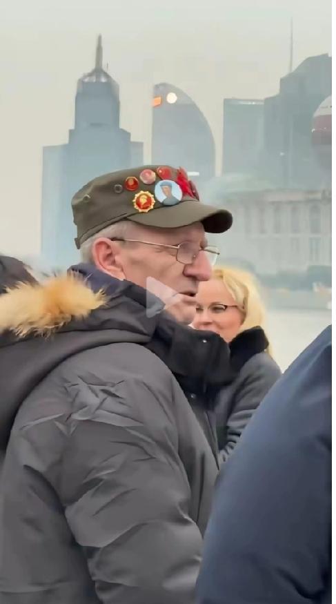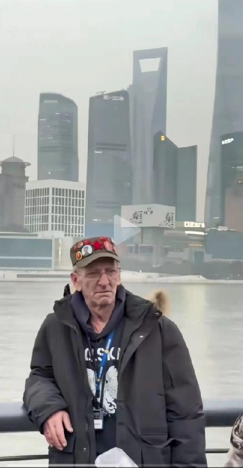 一位美国大兵,到上海外滩旅游。帽子上别了好多毛泽东主席的徽章。据说是在抗美援朝战场见识了志愿军的厉害。特别崇拜毛泽东主席!