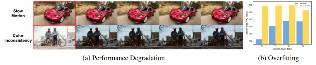 条件图像泄漏。(a)如Wan2.1-I2V-14B-480P在VBench-I2V上的结果所示,条件信号的泄漏会导致生成质量下降。(b)分块式FVD在领域内数据上增长,但在领域外输入上保持高位,表明传统I2V模型的泛化能力较差。