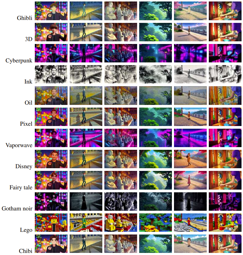 以往的视频风格化多依赖后期叠加滤镜,缺乏对画面内容的深度融合。为了打破这一局限,研究团队构建了一个包含12种典型艺术风格(如吉卜力、3D渲染、水墨画、乐高风等)的专属数据集,并在统一框架下推出了全新的I2SV(图像到风格化视频)范式。