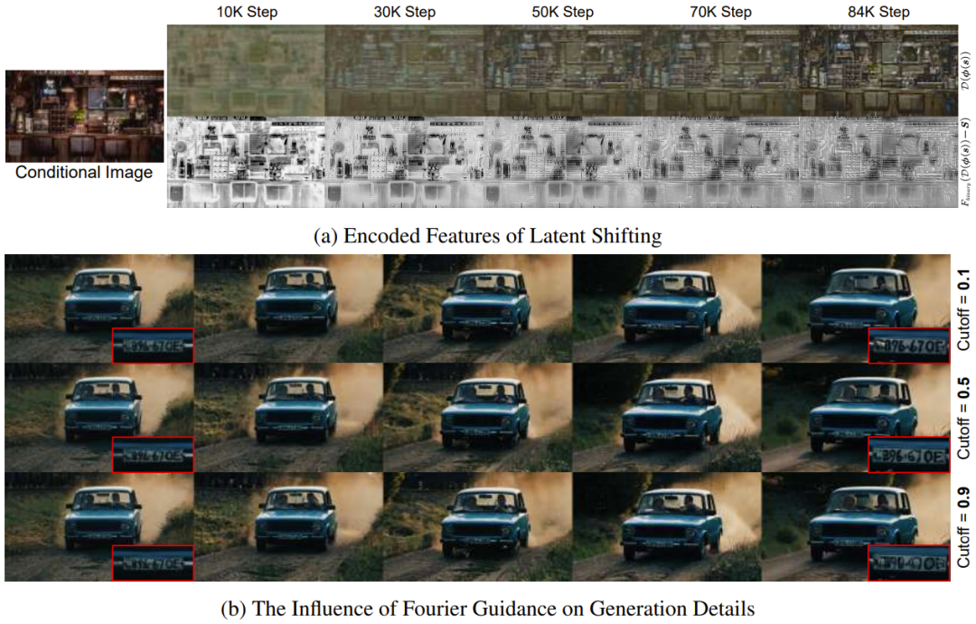 潜空间偏移和傅里叶引导分析。(a)随着训练的进行,可学习的投射ϕ(・)逐渐强调条件图像中的详细信息。(b)当使用较低的截止频率百分位数时,会注入更多高频信息。当截止频率百分位数设为0.1时,视频末尾的图形文字保持不变,而当截止频率百分位数设为0.9时,图形文字变得无法识别。