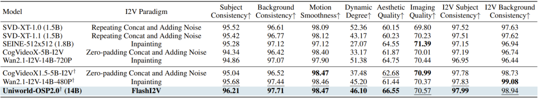 UniWorld-OSP2.0与其它开源视频模型在VBench-I2V基准上的表现对比