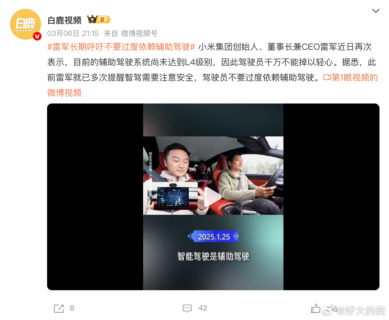 雷军多次呼吁不要过度依赖辅助驾驶雷军再回应使用辅助驾驶注意安全