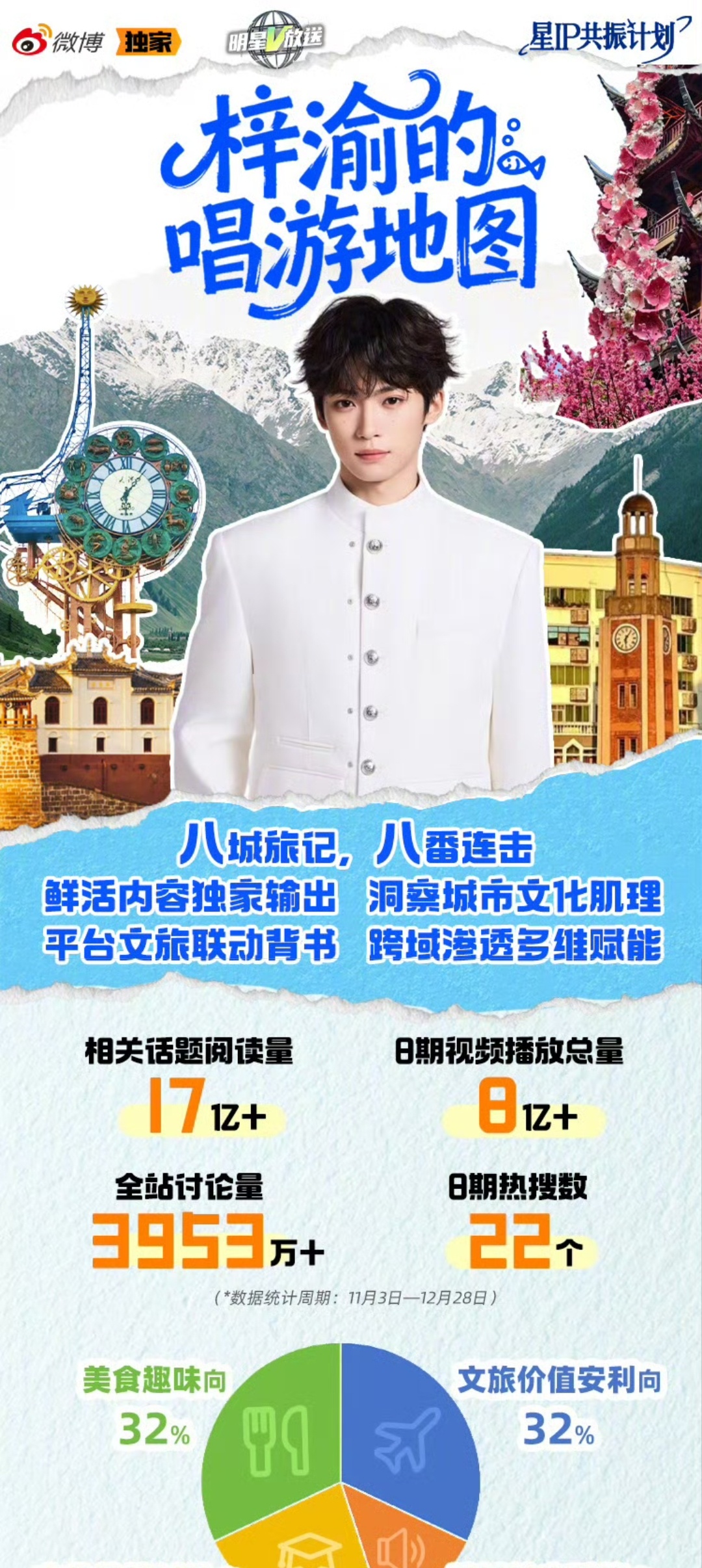 句句不提梓渝,句句都是梓渝!【演唱会】第一阶段44天4城10场12w+粉丝100%上座率❗单场拉动区域消费超1.9+亿❗共带动城市文旅消费8.35+亿❗每城一次非遗体验,以自身传播非遗文化❗【音乐节】每赴一城,以音乐为媒带动文旅消费,宣传各地美食文化——「梓渝的唱游地图」IP平台文旅联动背书,“渝”你同游掀起文旅打卡潮❗