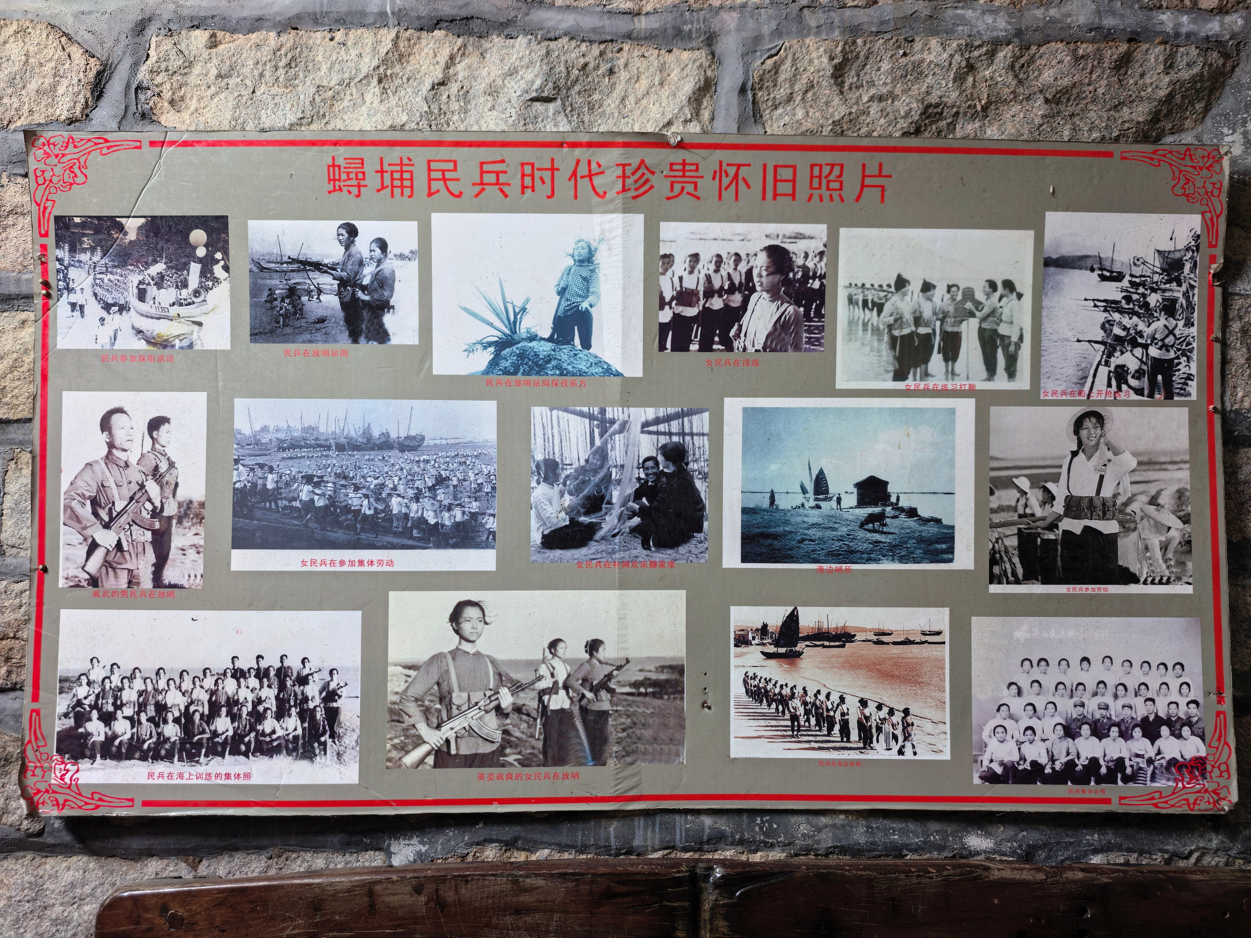 蟳埔村地处晋江入海口,扼守泉州湾“海门”,明清以来便是海防要地。上世纪六七十年代,为巩固东南海防,村里许多成年女子加入民兵组织。她们白天在生产队劳作、操练打靶,夜里则轮流站岗,于古渡口、枪城旁巡逻,义务查看灯塔、警戒海面。彼时,年纪最小的女民兵仅十八岁,却已扛起保家卫国的重任。一张泛黄的老照片定格了她们在枪城旁持枪放哨的英姿——那是“不爱红装爱武装”的忠诚写照。