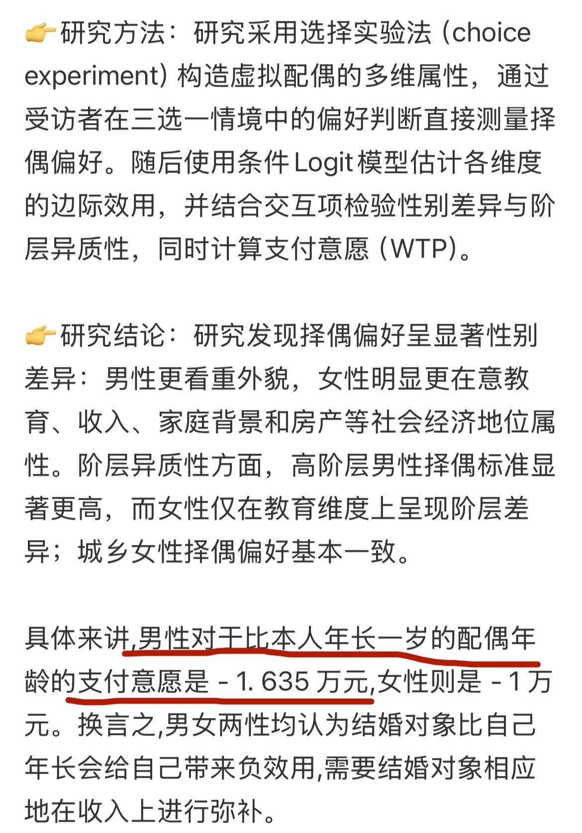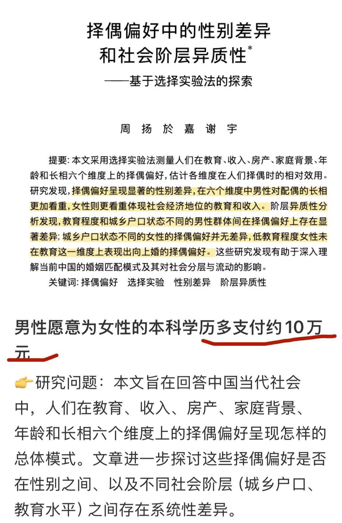 如何看待北大女教授观点【达则去父留子,穷则不婚不育】? 于是翻了一下此人的论文,看看都在研究些虾米……我比如下面这篇的结论 1.研究发现,男性愿意为年长1岁配偶支付的钱是-1.635万元…… 2.相比较高中学历,男性愿意为本科学历女性支付多10.24万元…… 我滴天啊,怎么都在研究男的愿意转移支付多少钱……尤其结论1真的不冒犯大龄女性吗…… 相关问题: ------------------------------------ 不愧是北大女教授,见识高且先进,确实如此。女人不乱结婚乱生娃,一个人不会太差的