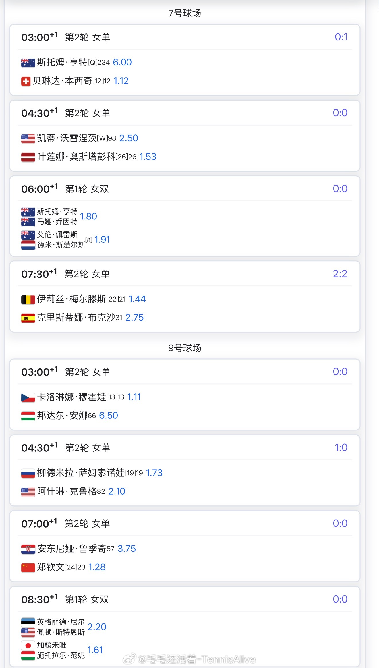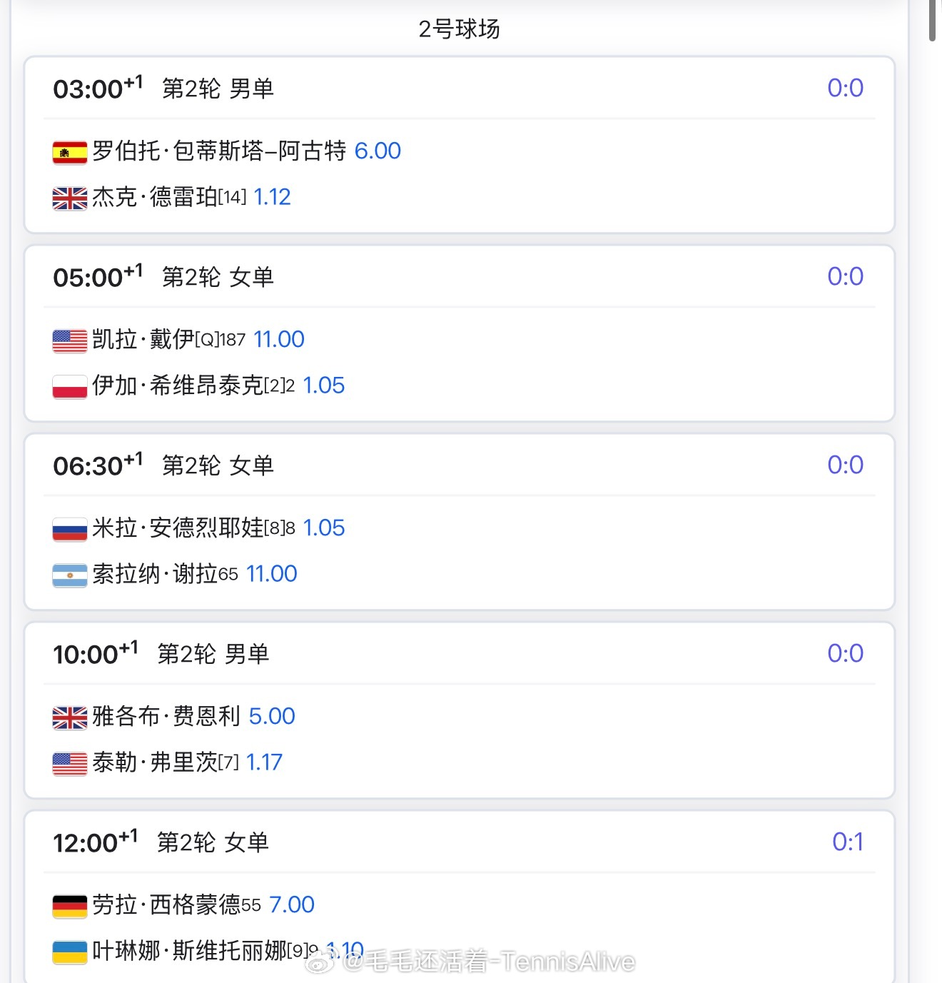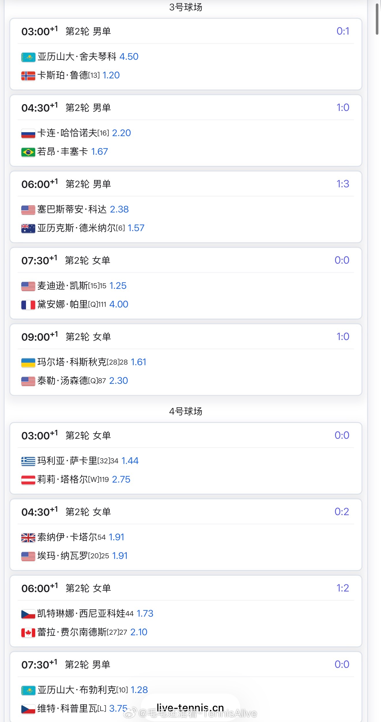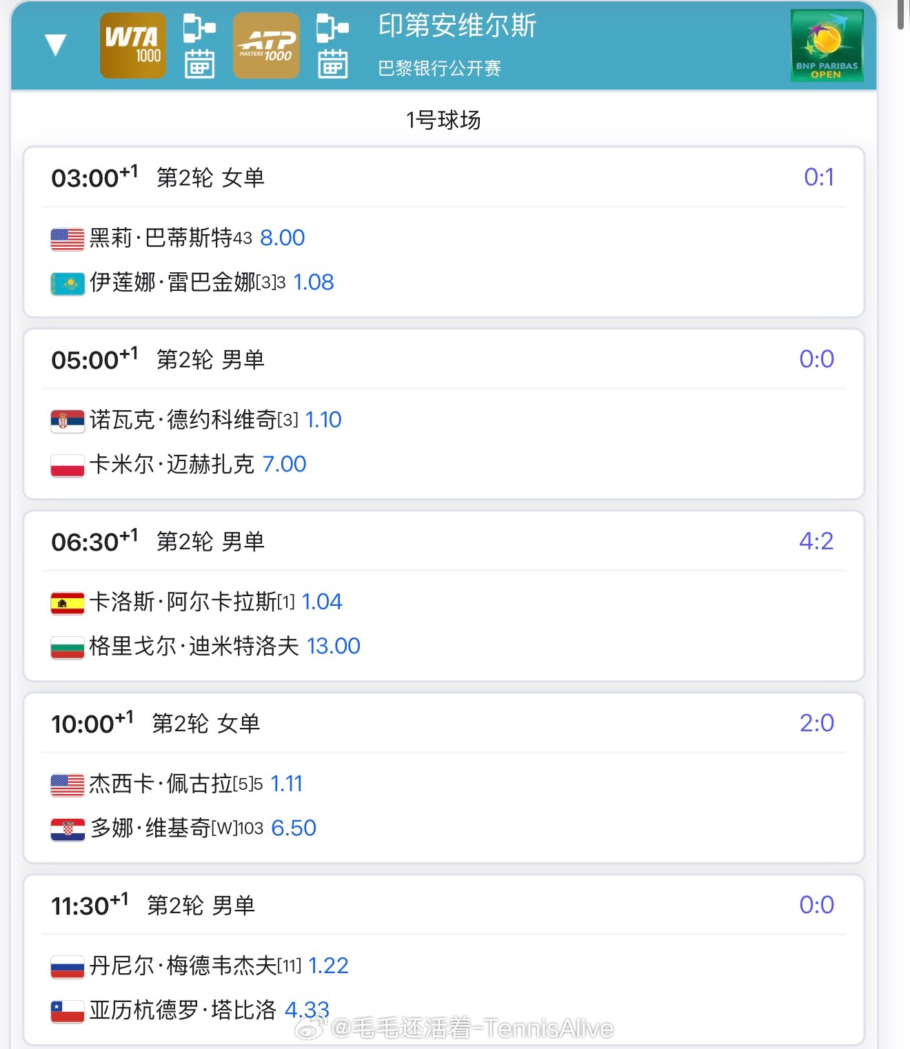 +3:00巴蒂斯特vs莱巴金娜+5:00德约科维奇vs麦赫扎克+5:00斯瓦泰克vs戴伊+7:00阿尔卡拉斯vs迪米特洛夫+7:00郑钦文vs鲁季奇 (明早咪咕直播)