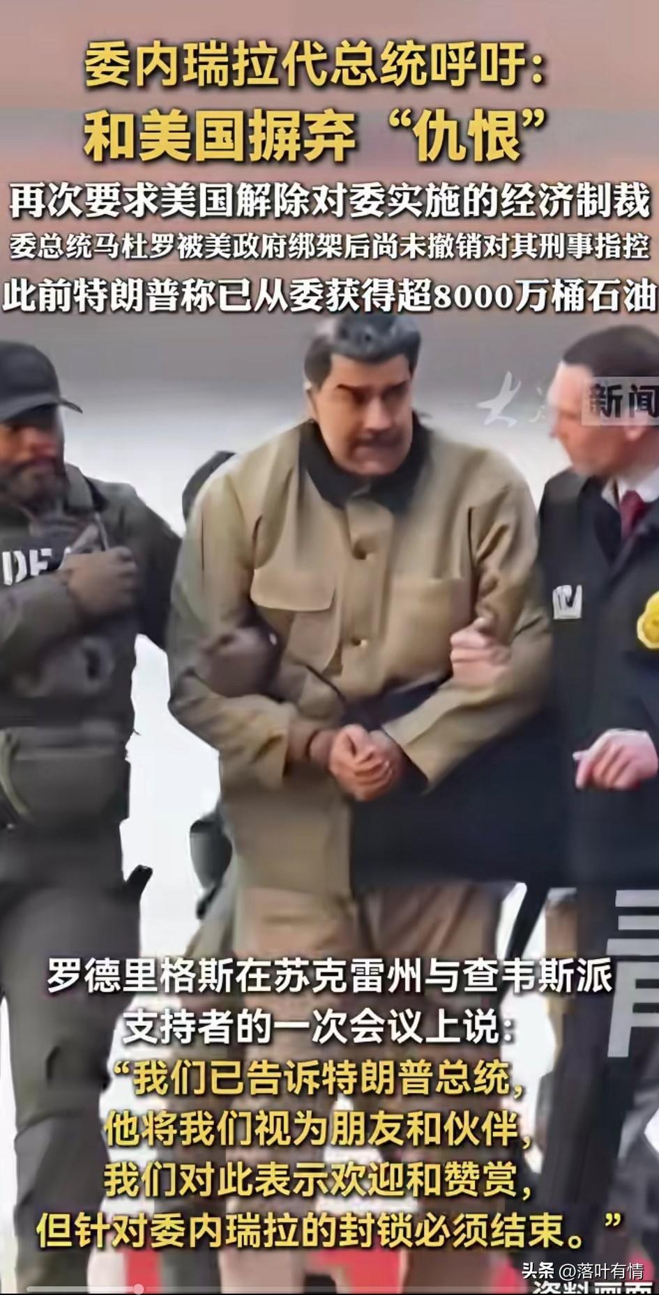 委内瑞拉代总统德尔西罗德里格斯不愧是女中豪杰,在马杜罗被抓的时候, 他她还是相当的强硬, 可是当上了代总统后, 对美国的态度来了180度大转弯, 当时还言之凿凿的说侵犯了主权, 如今却公开呼吁, 和美国摒弃仇恨, 再次要求美国解除对委内瑞拉的经济制裁,还表示在一次会议上, 已经和美国总统特朗普将我们作为朋友,我们对此非常的欣赏, 但要求他们停止对于委内瑞拉的经济制裁, 网友的评论很有意思, 在大是大非面前最先跪的一定是女领导,特朗普还公开宣称, 已经从委内瑞拉获得了8000万桶石油, 一个国家的总统被抓走了, 还能如此对待美国的只有委内瑞拉可, 你看人家伊朗, 最高领袖被斩杀之后, 还会发动反击, 委内瑞拉可是全程没敢动手, 嘴上说的非常的强硬, 实际确实对美国非常的卑微, 要想守护自己国家的安全, 还是得靠实力才行!