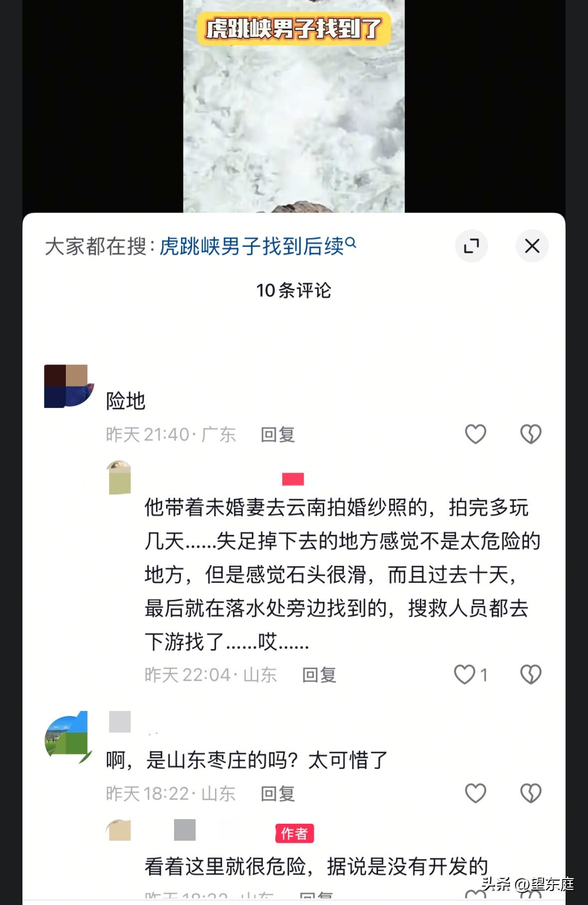 大年初七在虎跳峡不慎落水的29岁男子是一名美术老师!这位老师姓杜,他人很善良,很热心。一位同事对他的人品,给予了高度评价。 杜老师来自山东枣庄,如果不是这个悲剧的发生,他和未婚妻很快就要结婚了。 他们抱着满心欢喜,去到了云南。 原本,他们安排的行程,是一举两得! 一方面,是去丽江拍摄婚纱照,一方面是趁着假期的尾巴在周边地区好好玩几天。 然而,所有美好的一切,都在大年初七那天被改变了。 当天,杜老师携女友一起在向导带领下来到了中虎跳峡游玩。当时,一起同行的人有不少,就在大家纷纷打卡拍照的时候,悲剧突然降临。 没有人注意到,杜老师究竟是怎么掉进水中的。大家都是听到其女朋友的大声呼救后,才后知后觉发现有人落水。 悲剧发生后,杜老师的女友和向导都曾尝试积极施救。只可惜,最终没能敌过汹涌的江水。 事后,女友反馈说,杜老师之所以不慎落水,是因为去了江边洗杯子…… 经过多天的搜救,事情在3月6日有了后续: 年仅29岁的杜老师已经确认不在了,他的遗体在落水处下游的一处水域被发现。 在这个事件里,真的让人无比心疼! 一个善良又热心的人,怎么就突然不在了呢?原本,他是年轻有为的老师,即将和女友结婚,从此就要迈入为人夫、为人父这种新的人生。可还没等到那天,他的生命便不在了。 如此种种,他的家人该有多么难过啊? 经此一事,希望所有在路上游山玩水的朋友们,务必打起十二分精神。不管去到哪里,一定要小心谨慎,敬畏自然![祈祷][祈祷][祈祷]