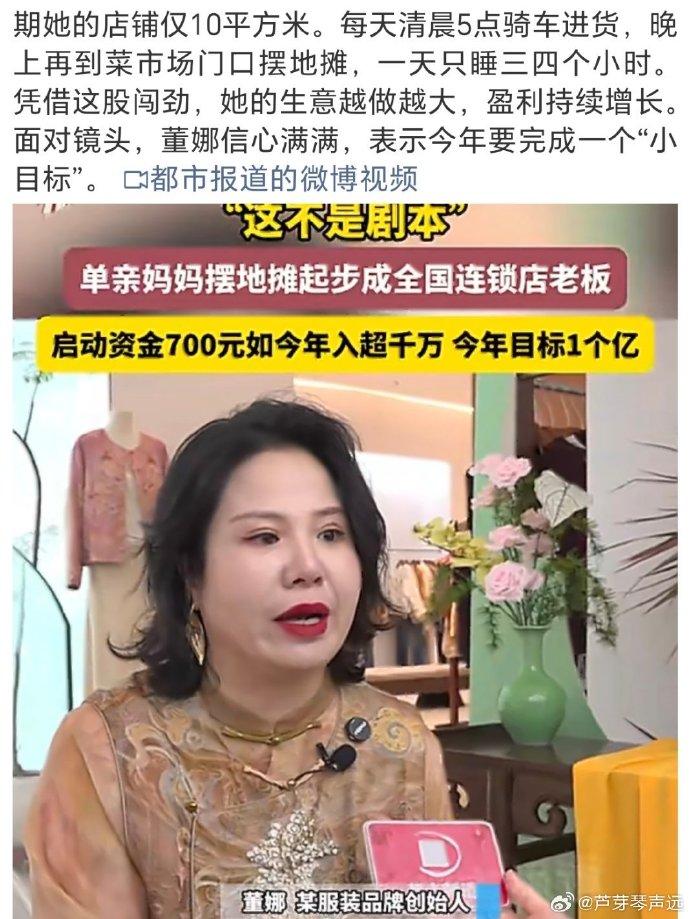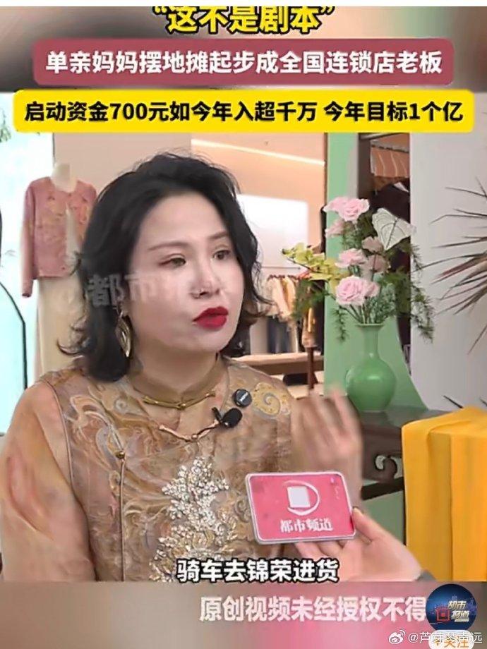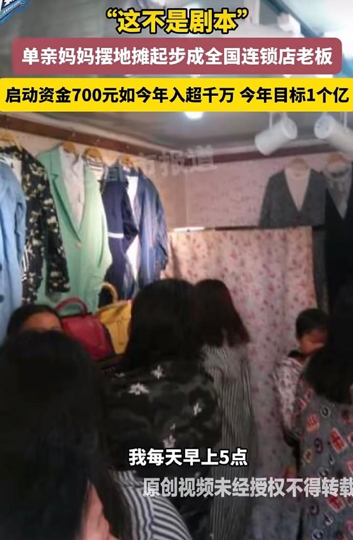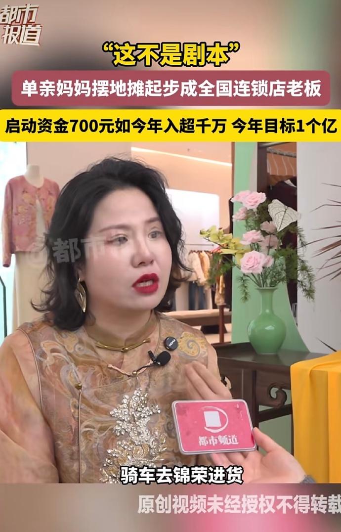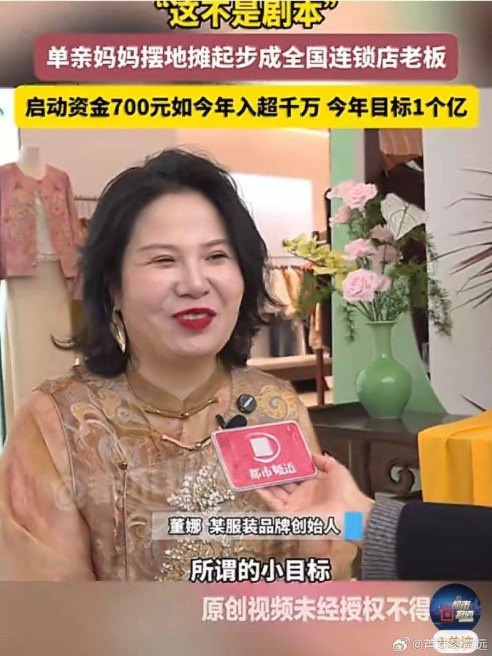 真的很伟大!河南郑州,90后单亲妈妈董娜彻底火了,拿着700块钱摆地摊起家,现在一年净赚几千万,竟然还要冲击一个亿的小目标,网友:当妈的狠起来,连财神爷都得绕道走。 2012年那会儿,董娜兜里就攥着仅有的700块启动资金,一头扎进了服装地摊里。 起初她那小店只有10平米,窄巴巴的还没个厕所大,天天凌晨5点就得骑上车去锦荣市场抢货进货。 白天守店,晚上还要拖着大包小包去菜市场门口支摊子,一天满打满算就眯瞪三四个小时,困得眼皮子打架也得死撑着。 就这样靠着一股子豁出去的蛮劲,她硬是从地摊小贩翻身成了连锁品牌的老总。 现在的她穿着自家绣满盘扣的新中式上衣,妆容精致,大金耳环晃晃悠悠,气场全开地对着镜头谈笑风生。 评论区里大家伙儿都看傻了,有人感叹,这中间吃了多少苦只有她自己知道,这单亲妈妈坚强起来真没男人什么事了。 还有人直言佩服,一天只睡几个小时,这种强度一般人根本扛不住,长期这么干简直是在夺魂夺舍。 更多网友觉得这就是现实版的女性觉醒,与其指望别人,真不如自己手心里攥着钱来得踏实。 看着董娜这华丽转身,心里真是酸甜苦辣什么滋味都有。 对于单亲妈妈来说,一边要挺直腰板搞钱独立,一边要当爹又当妈地带娃,这种双倍压力简直能把人活生生压垮。 可这就是母爱最伟大的地方,为了给孩子撑起一把遮风挡雨的伞,原本娇弱的女性能瞬间变成铁打的金刚。 她不只是在卖衣服,更是在用命给孩子换一个谁也瞧不起的未来。 这世上没什么天生的赢家,所有的光鲜亮丽都是用无数个不眠之夜换回来的。 在这个靠本事吃饭的时代,只要当妈的心里憋着一口气,终究能开出最灿烂的花。 对此,你怎么看?