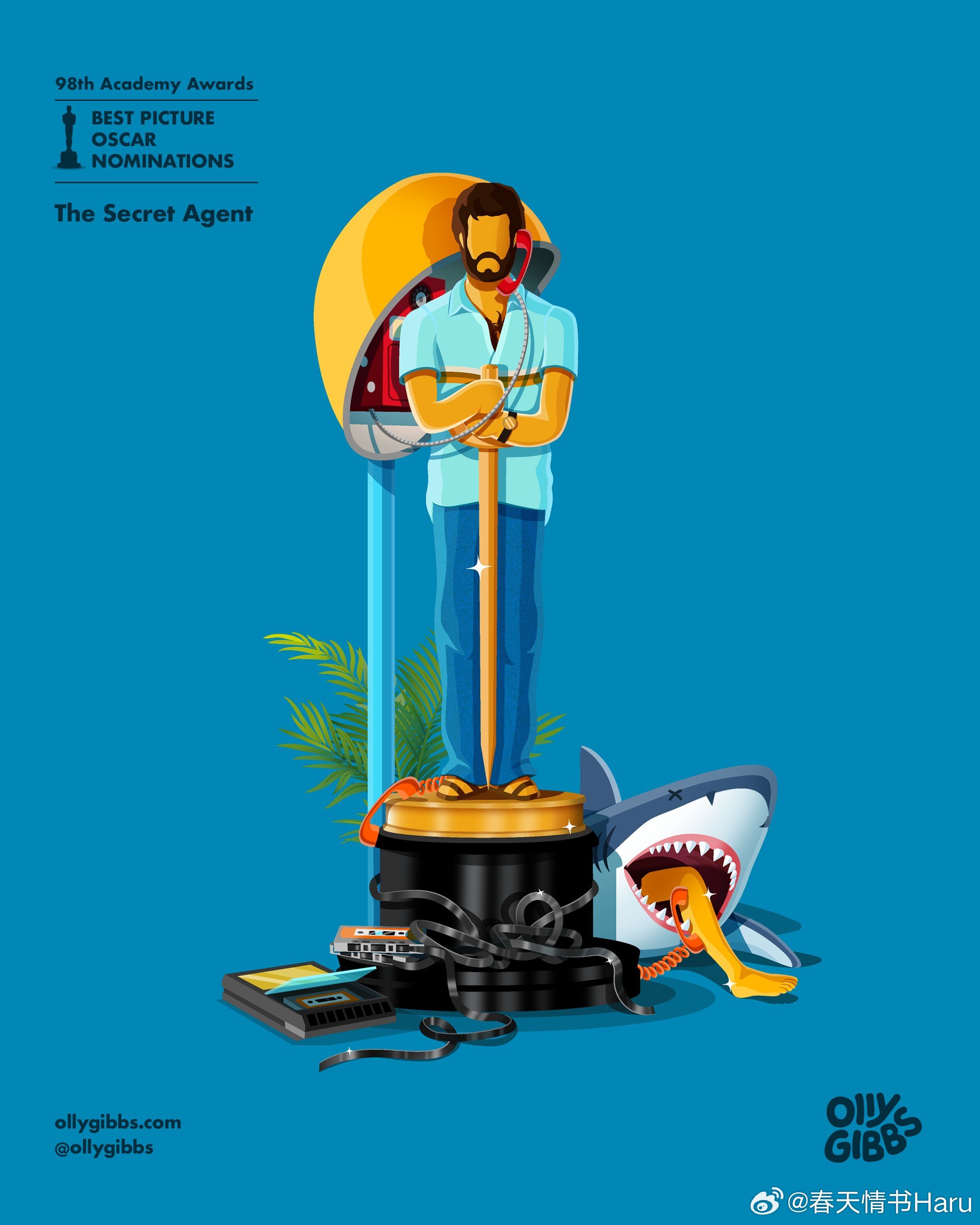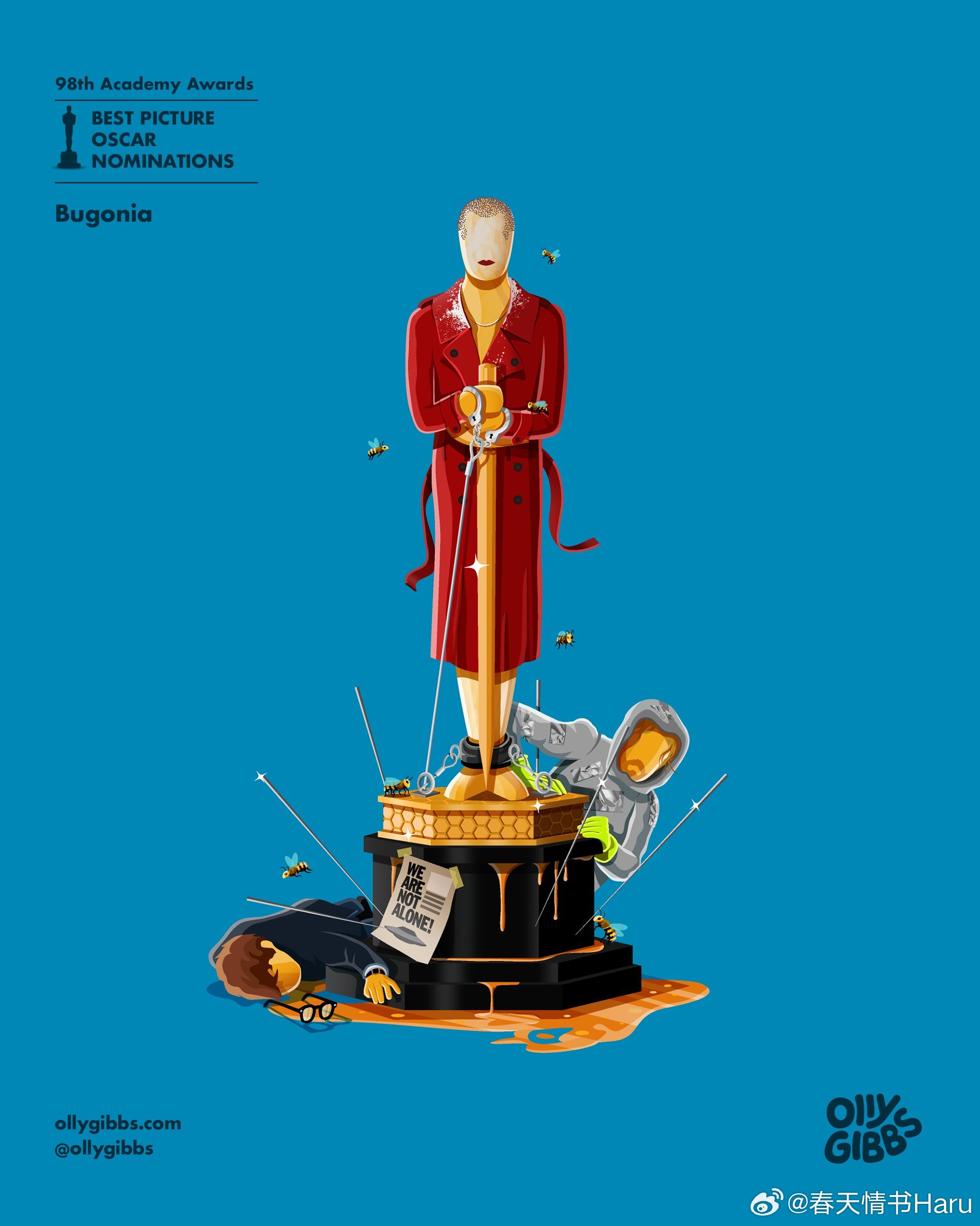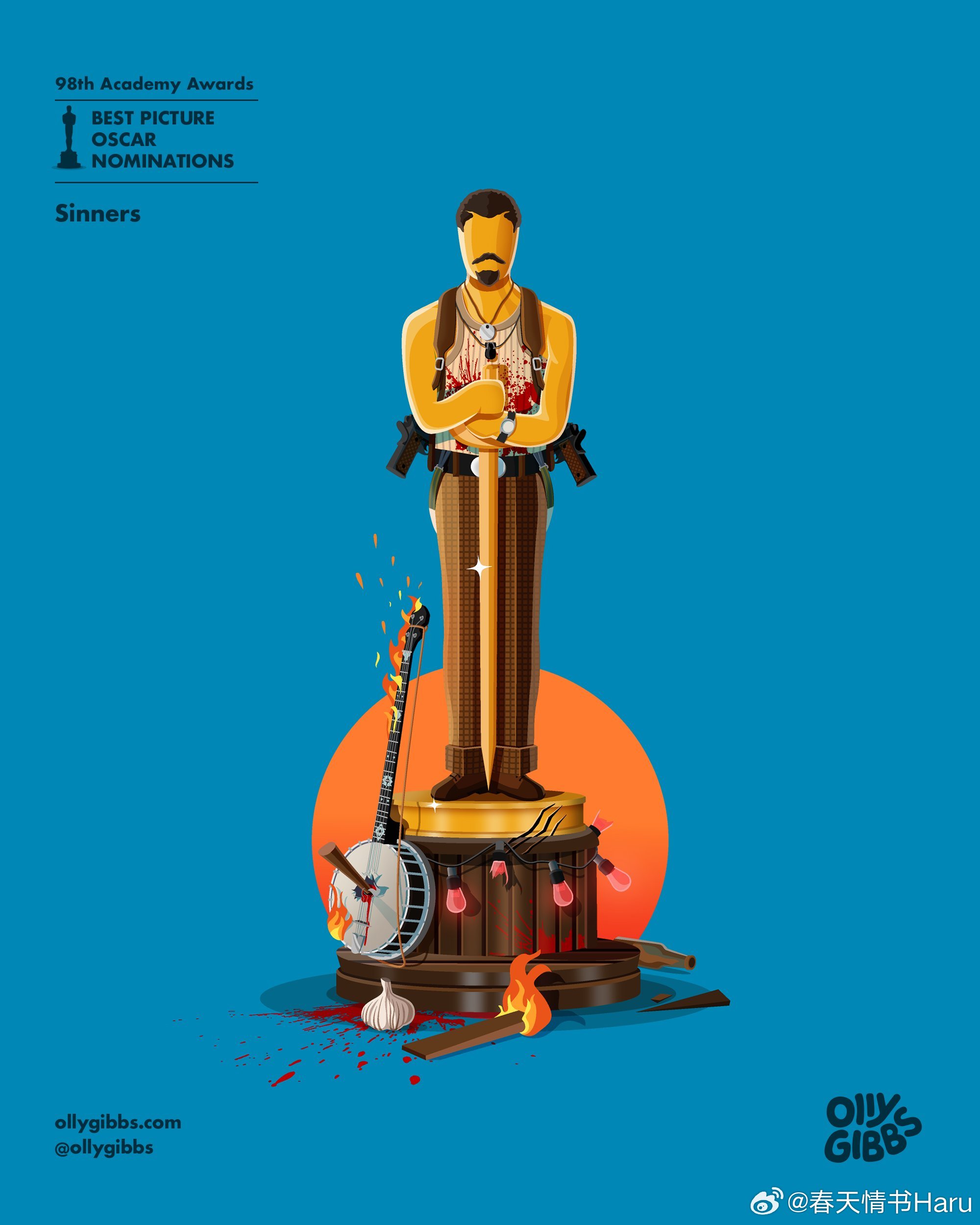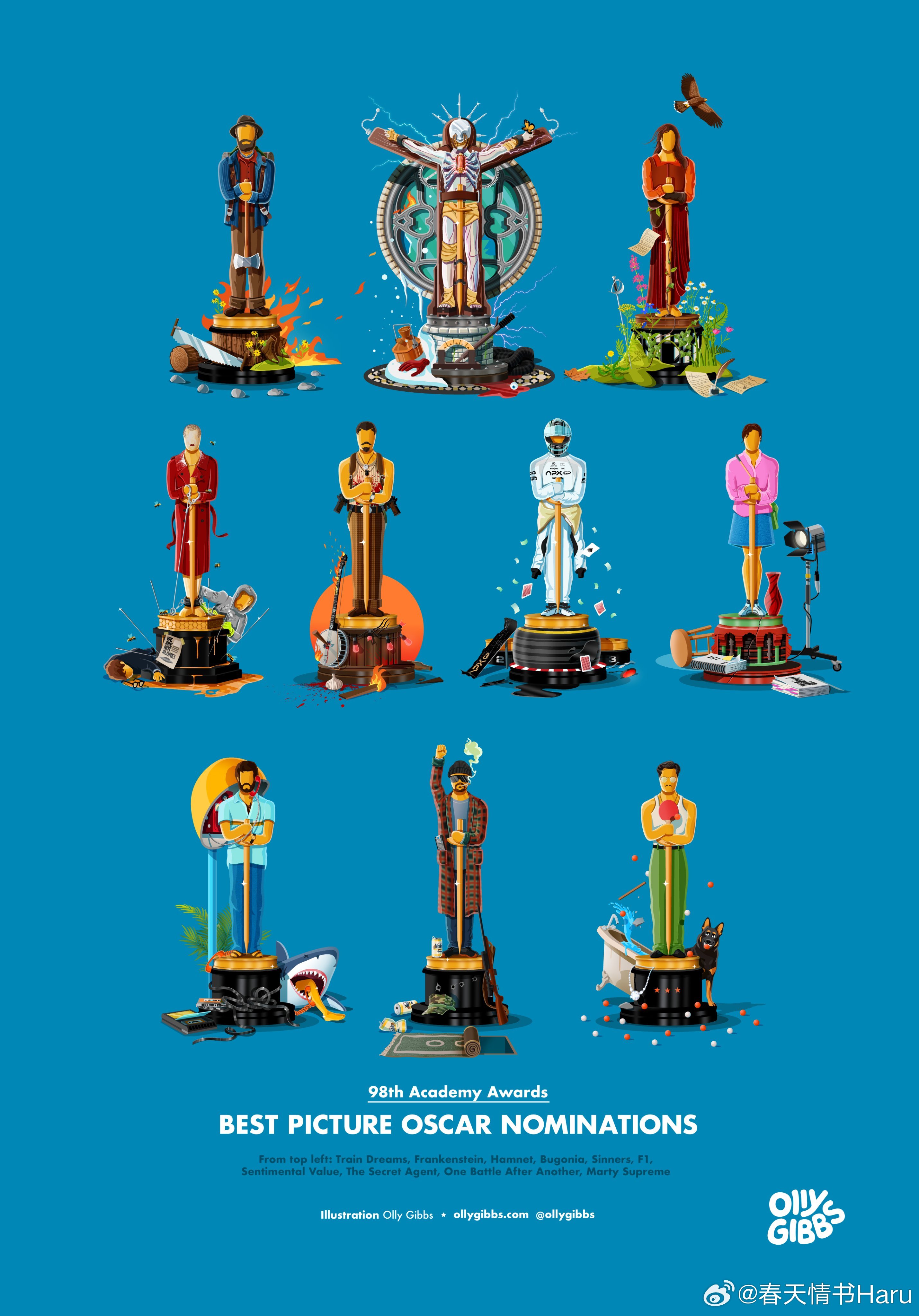 艺术家Olly Gibbs绘制的今年奥斯卡最佳影片提名的小金人海报