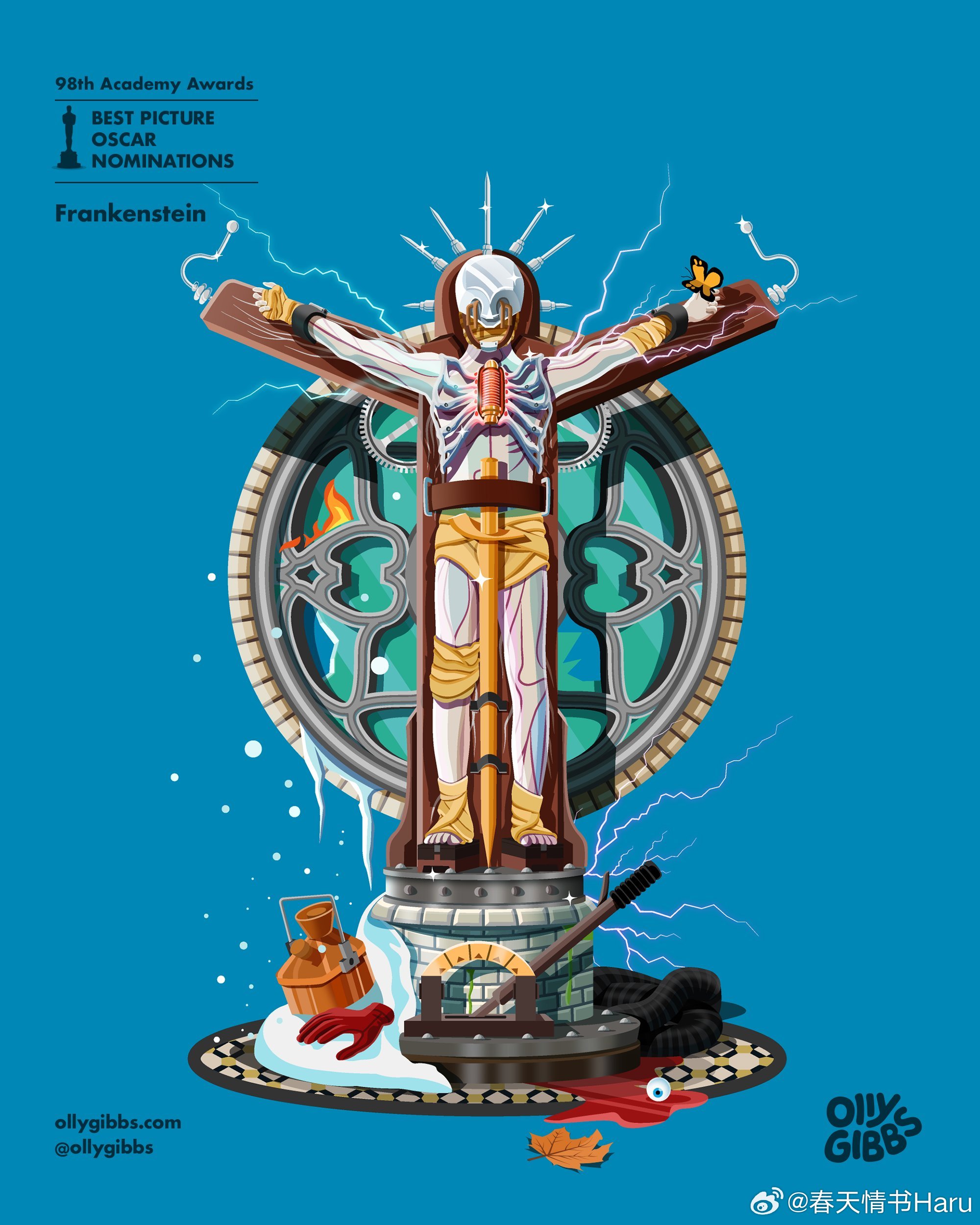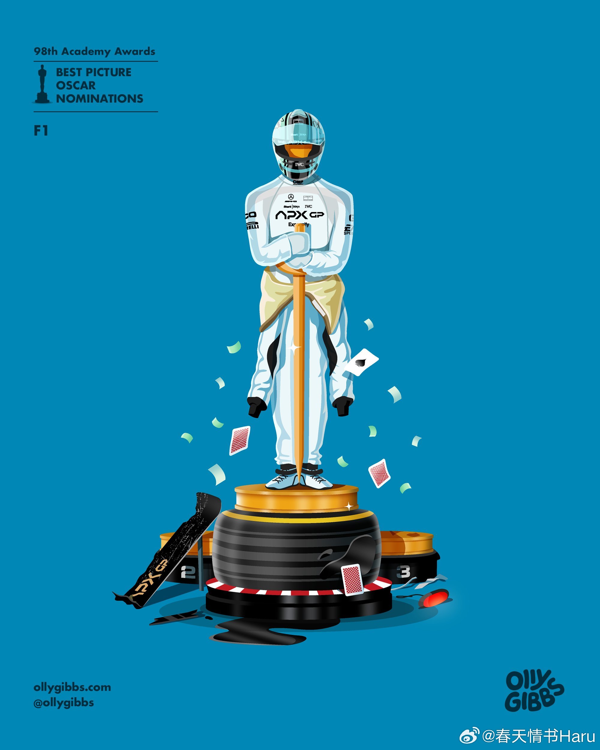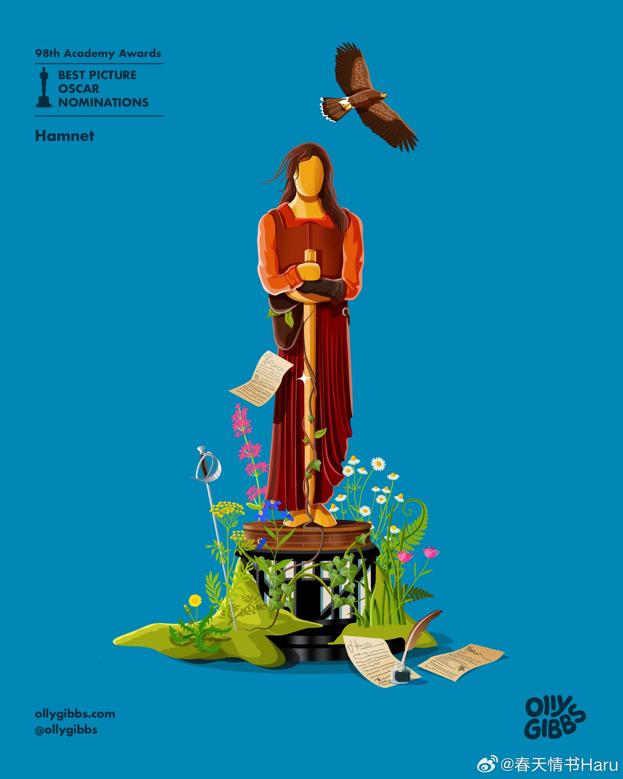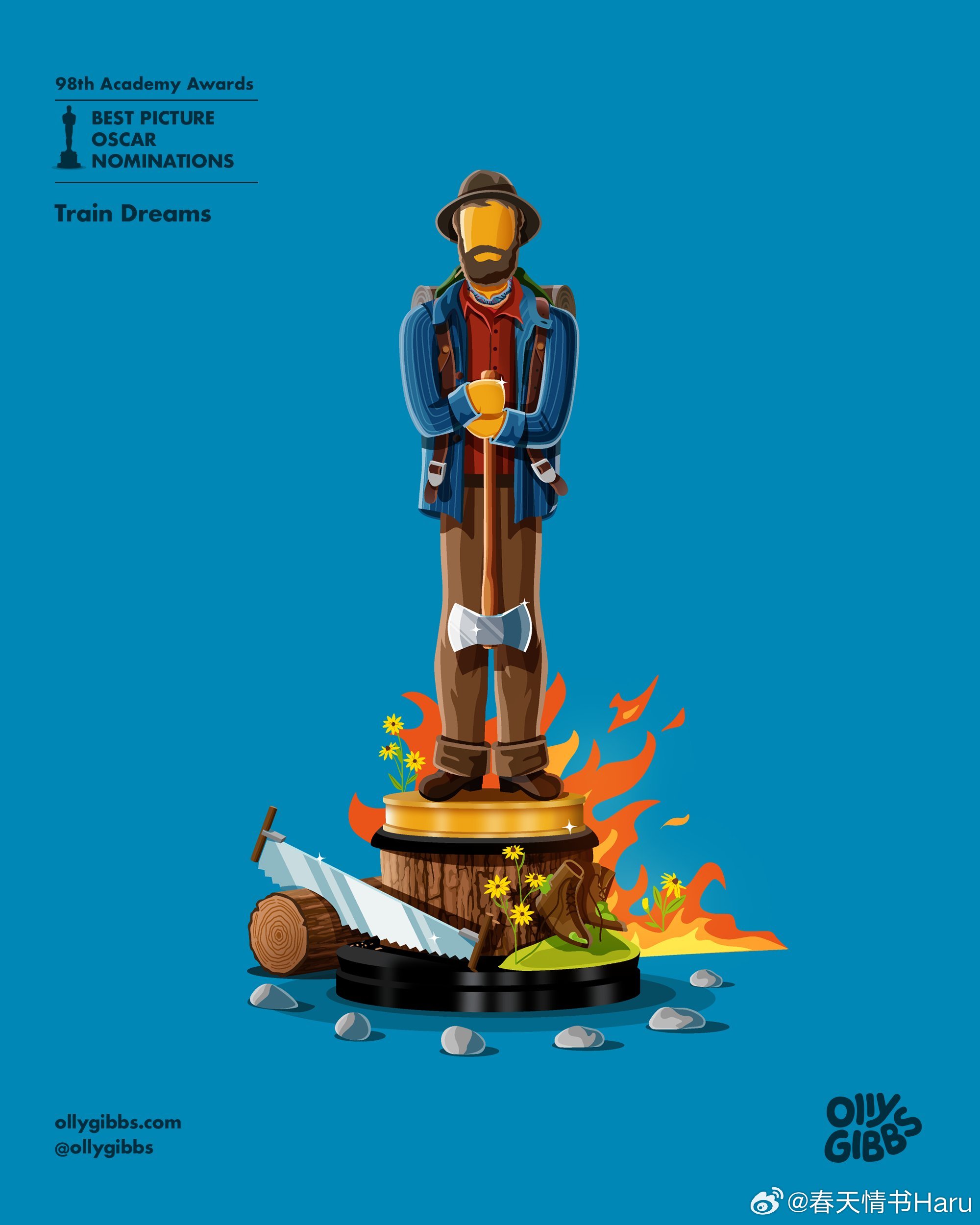艺术家Olly Gibbs绘制的今年奥斯卡最佳影片提名的小金人海报