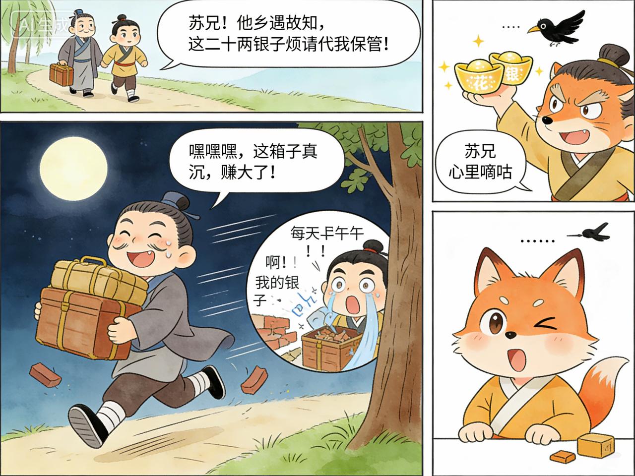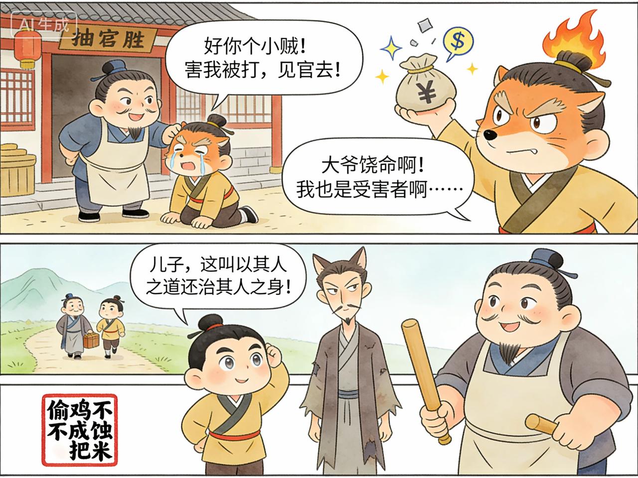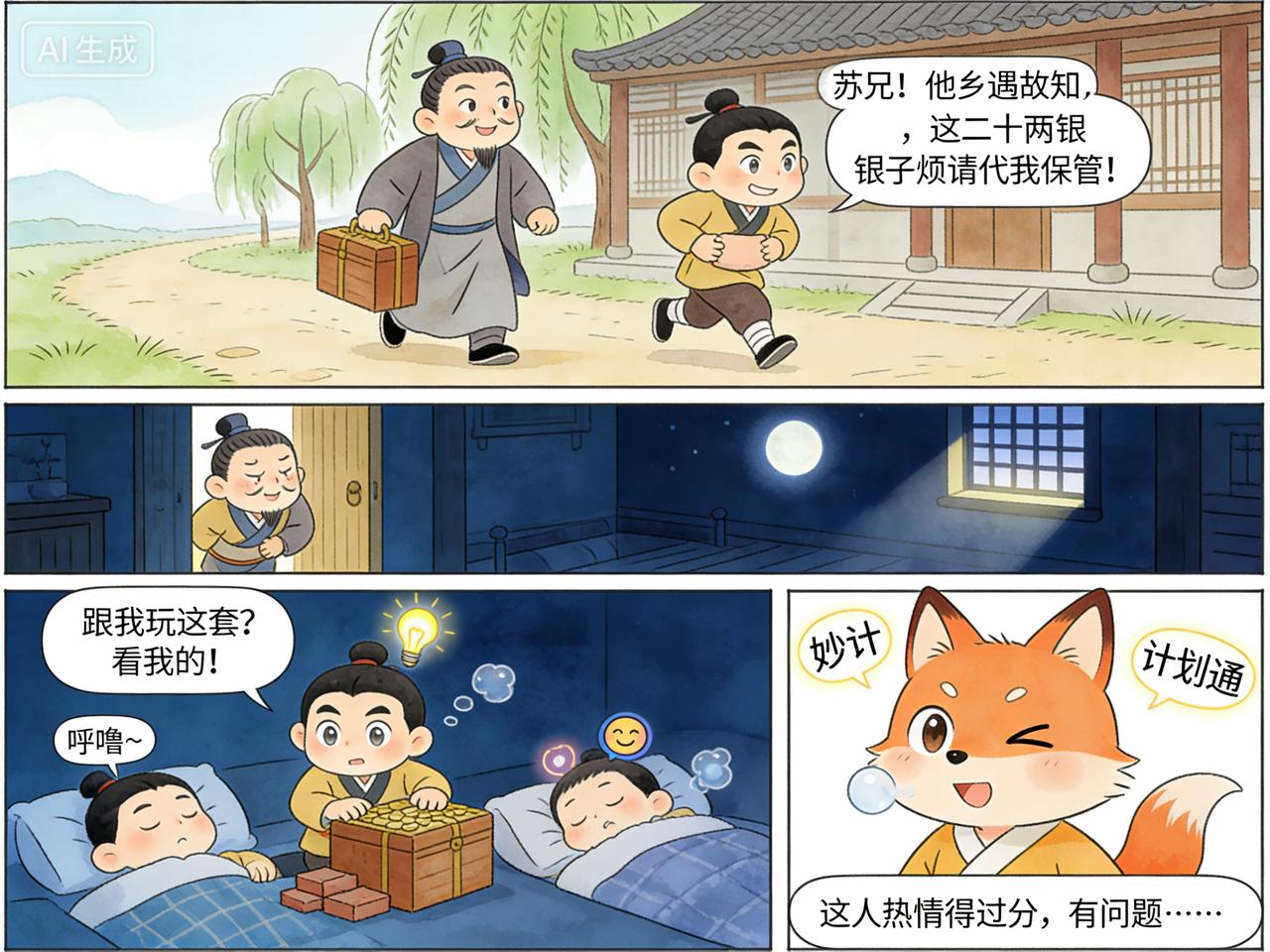 通州商人苏广在外地做完生意,带着儿子回家。半道遇到一个叫做纪胜的人,十分热情,交谈之下,纪胜声称自己也是通州人,正要回家。 他乡遇故知,更兼是同行,自然格外亲切一些, 于是三人结伴而行。纪胜见到苏广年长持重,于是拿出自己的二十两银子,放到苏广行李箱内,请其在路上代为保管。 如此三人赶了几日路程,这天住在一家店里,纪胜声称自己拉肚子,几次开门上厕所 。 苏广行走江湖多年,见纪胜如此,知道他不安好心。于是,借着纪胜外出的机会,偷偷将自己的银子和纪胜的银子放在身边,而用衣服包了一些砖头放到原来箱内,假装熟睡。 过了一会儿,纪胜果然偷偷回到屋里,蹑手蹑脚来到苏广父子二人跟前,看到二人仍在熟睡,轻手轻脚拿出行李箱,扬长而去。 第二天早上,苏广起身故意大嚷自己银子丢失,并责问店主,与纪胜合伙偷了自己银子,他的儿子不知底细,一听父亲之言,大怒之下对店主就是一顿暴打。直到苏广偷偷告诉他真相才罢手。 苏广对店主说,我去县里报官,让县里捉拿小偷,如果捉住那个贼人,还得麻烦你去大堂之上给我作证。店主只求苏广不再追究失银责任,自然连连答应。 苏广知道纪胜发现上当后,一定会赶回来。交代完后,就和自己儿子赶紧从小路走了。 果然纪胜发现上当后,就赶回店里。店主一看到纪胜回来,就将其扭住,边打边骂,你这小贼偷了银子,还让我受连累。说着就要扭着纪胜见官。纪胜没有办法,只得把实情告诉店主,并磕头请求店主绕了自己。这时苏广已经走远了,无论如何也无法赶上了 纪胜打的如意算盘,先把自己财物交给对方,使其放松警惕,趁机行窃。结果没想到被对方识破,将计就计。偷鸡不成蚀把米,不仅没把人家的钱偷到,反而把自己的钱给丢了,真是自作孽不可活啊
