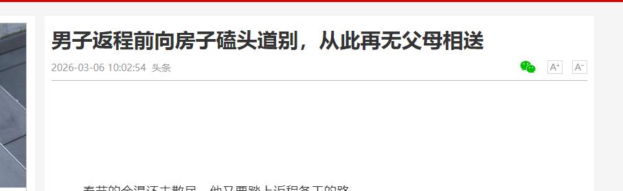 泪目!辽宁男子父母均已去世,独自一人在老家过年。返程时因无人相送,男子离开前向老房子磕头道别。 今天这期,咱们不聊八卦、不蹭热度,咱们唠唠现实,聊聊咱中国人心里最疼的一块——家。 一句话带过这事儿:辽宁,有个父母双亡的男子,春节,独自回到自家老宅,临走时把屋里屋外收拾得齐齐整整,最后对着老房子磕了个头,道了别,再锁门上路。 这一幕,被发到网上后,隔着屏幕,有人破防,有人热泪盈眶。 有网友说:长大成人那一刻,我才懂,家人还在时,哪怕住的是土坯房,心都是暖的。 等父母走了,就算大厦豪宅,自己也只是个过客。 其实大家都懂,能引发全国这么大的共鸣,不只是因为男子这件“小事”,而是每个人都在画面里或多或少找到了自己的影子。 有人说他一个人“守年”,是不是太孤单?但对于独自在外谋生的人来说,回老家过年真的就是一种仪式感。 哪怕爸妈都不在了,哪怕老屋破旧,哪怕连邻居都变了,但总觉得家、院子、熟悉的土路,是记忆里唯一还没变的东西。 有人提问,屋子里那么冷清,留他一人是不是太难受? 其实,所谓的年味,不是热热闹闹就是好,真正的年,其实是思念还在,情感还在。 男子把院落抹一遍,把屋子收拾一遍,盆盆罐罐倒水倒土,最后盛装“汇报”,叩首告别。 网友评论:很多人其实都在做同样的“仪式”,只是没被镜头记录下来罢了。 细想想,其实这过程中藏着很多中国人的情感逻辑。 老屋不只是房子,是父母在、家在的证明,也是遥远童年的一丝慰藉。 等日子一天一天走下去,父母的离世,才让人真切感受到“物是人非”的无力。 许多网友在评论区自述:小时候总盼着过年热闹,觉得父母念叨太唠叨,非要一大家子坐一起吃年夜饭。 等一路打拼到外地,有了孩子,有了事业,突然明白,有些人和事,真的是一去不复返。 这位男子跪拜老屋,其实是跪给回不去的童年,也是在和逝去的亲人告别。 有人说男人流泪太脆弱,但小编看到一个成年人在阖家团圆的年节里,卸下盔甲、承认孤独,这就是极其厚重的情感沉淀。 网友很多精彩评语,说得挺扎心:“父母健在时,家是归处,也是盼头;父母离世后,老屋成了归途,人也就这么长大了。” 刷短视频的朋友都懂,咱中国人的“家文化”非常重。 房子是建筑,家是精神寄托。 无论你是白领还是工友,是中产还是打零工,每年春节都想回家。 哪怕平时和父母有鸡毛蒜皮的小矛盾,到头来,父母那盏灯才是我们在外拼搏最大的底气。 这段跪别老屋的视频,其实是一组极具穿透力的表达。 没有激烈的哭嚎,没有刻意卖惨,就是静静地收拾—关门—跪拜—起身—锁门—离开。 很多观众被这组“慢镜头”戳到心里去了。网友热议:“房子可以拆,回忆却拆不掉。” 还有人说:“父母在时,天塌了都有处跑;父母走了,就只能自己站好了。” 评论里,被点到的几乎都是成年人。 年少时总觉得父母的啰嗦是负担,而今才理解,这份负担其实是这个世界最温柔的守护。 咱们国家现在经济发达了,很多人从农村进了城,父母一直留在老家守着那一亩三分地。 每逢春节,大包小包往返路上,多数是为父母提一箱年货、嘴里唠叨一句“没什么好东西”,其实就是报平安、守温情。 可光阴流转,谁还在家里等着你,是每个北漂、南漂、东漂、西漂都要思考的问题。 老家的房门锁上了,父母的呼唤声渐渐远了,那种无可挽回的遗憾,就像男子跪别老屋那一瞬,突然变得刺眼具体。 其实网友最感慨的,还不是跪拜动作本身,而是那份发自内心的无能为力。 父母去世,有些话、一些遗憾,是再有钱、再有名都弥补不回来的。 都说“子欲养而亲不待”,以前只当老话听,如今看多了这样的故事,才彻底明白。 人活着,总觉得来日方长,父母总在,不怕天塌。 可风雨真来了,有些事,就是再悔都来不及。 这让小编想到一句流传很广的话:父母在,人生尚有来处; 父母去,人生只剩归途。 如果大家仔细观察,这其实姑娘小伙们共情的高频句子,因为它把万千中国人的家庭情感说到极致。 这里不是卖惨,而是直面生活的酸甜苦辣。 谁都看得见,父母健在的时候,回老家像回到港湾; 等父母都不在了,你再踏进老屋,那叫返乡,而不是回家。 房子还在,可里面的亲人,早已空无一人。 这段视频下方,许多网友分享了自己返乡、独守老宅的经历。 有的是家里父母身体还好,今年回家过完年依旧不舍。 也有父母已经去世,回来只能面对空荡荡的房子,每一个角落都充满记忆。 有的人拍了照片,有的人带了小孩回去“认祖归宗”,想让下一代记住这片土地。 其实,老家对于许多人来说,是生活的“来处”,也是人生的“归处”。 参考:中华网·新闻——男子返程前向房子磕头道别,从此再无父母相送