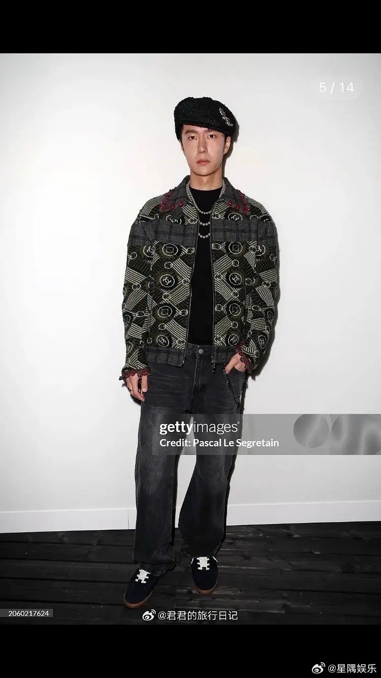 时装周巴黎时装周王一博LOEWE格纹围巾叠搭黑色外套,帽子一戴低调有型,又酷又