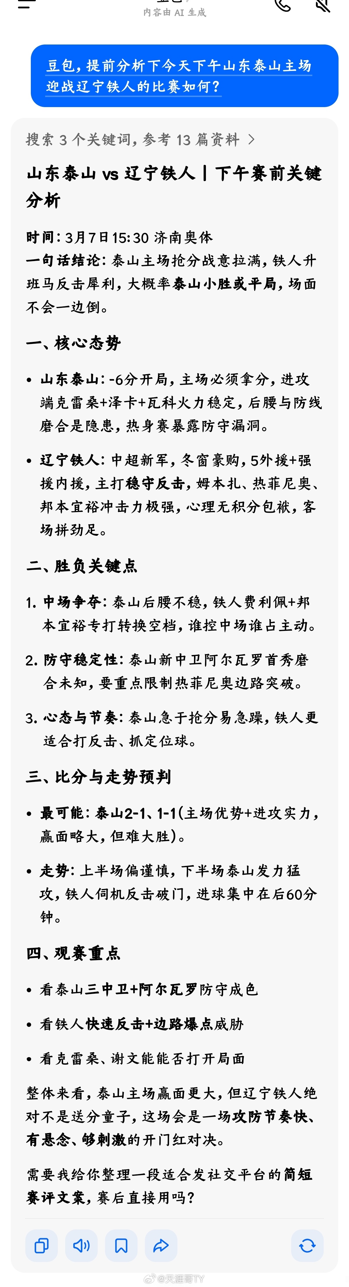 山东泰山山东泰山外援动态 豆包:泰山大概率小胜铁人克雷桑/马德鲁加:八九不离十