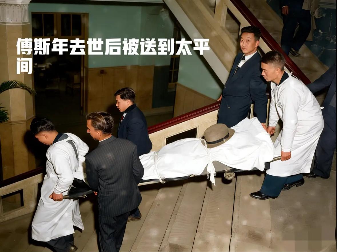 1950年,年仅54岁的傅斯年突然离世,这是他被送往太平间的一张罕见照片。12月20日,在台湾大学校长任上的傅斯年,刚在 “监察院” 的质询会上慷慨陈词,回到休息室便一头栽倒,再也没有醒来。 这张照片里,他被白布裹着,那顶标志性的礼帽还放在上面,被人抬着走下楼梯,送往太平间。一代史学巨擘,就这样走完了他跌宕的一生。 傅斯年的一生,始终站在时代的风口浪尖。作为 “五四运动” 的学生领袖,他曾走上街头振臂高呼;作为中央研究院史语所的创始人,他用现代科学方法整理国故,被胡适誉为 “人间一个最稀有的天才”。 到了台湾,他顶着台大校长的头衔,想在孤岛之上为中国文脉保留火种,却深陷政治漩涡,身心俱疲。他那句 “归骨于田横之岛” 的悲叹,成了他晚年心境的真实写照。 他的死,让整个学界震动。胡适痛哭失声,蒋介石亲题 “国失师表”。有人说他是累死的,也有人说他是被气死的,但无论如何,那个敢说敢做、一身傲骨的 “傅胖子”,终究是倒在了他为之奋斗一生的学术与理想面前。