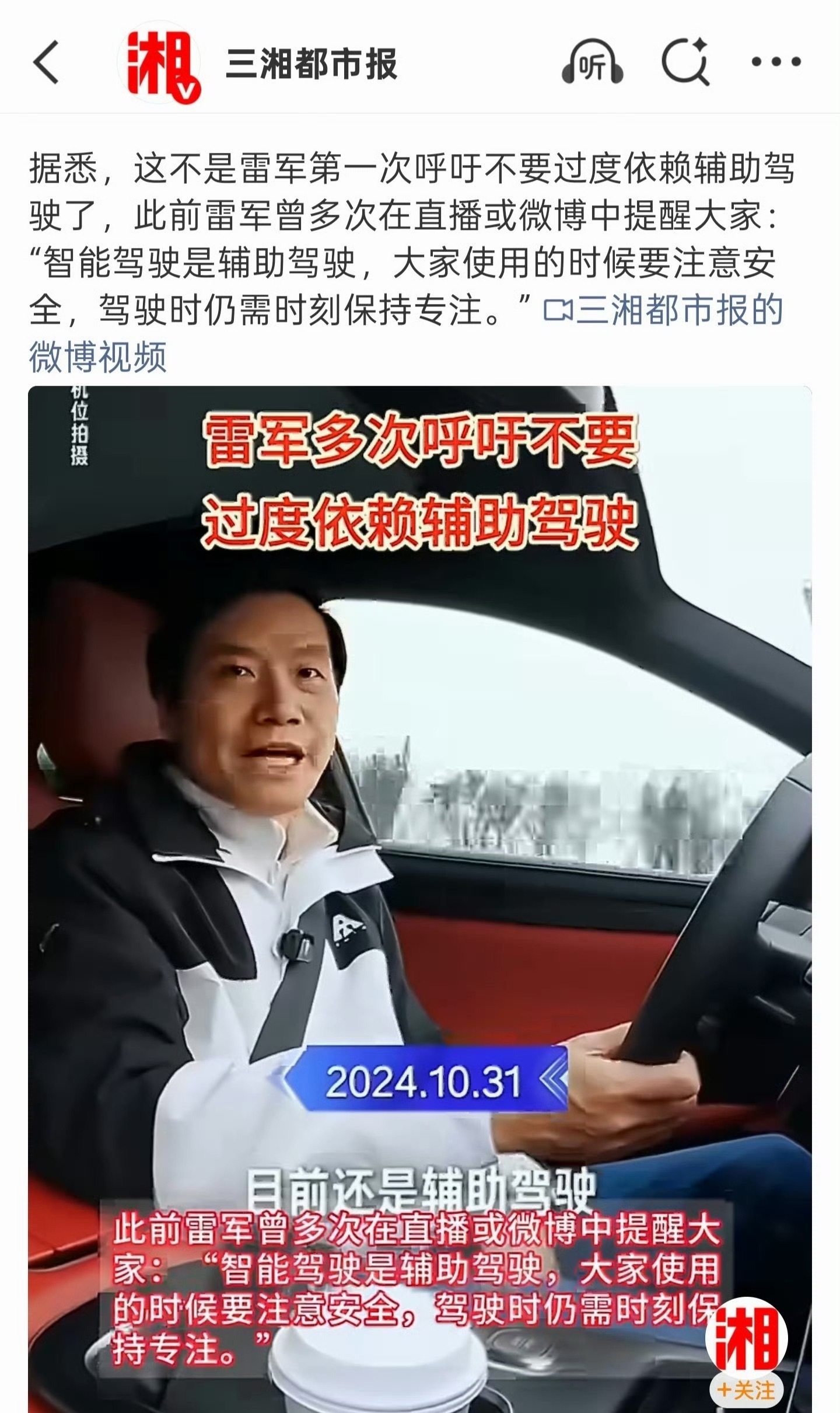 科技是用来帮我们更安全,不是让我们更放肆的,不管功能多强,永远记住:人是最后一道防线,别拿自己和别人的生命开玩笑。雷军多次呼吁不要过度依赖辅助驾驶