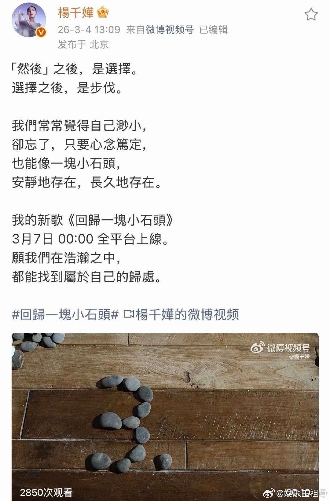 杨千嬅把红馆搬进四合院从红馆到四合院,杨千嬅用歌声架起桥梁。S级直播首唱《回归一块小石头》,360度全方位记录,唱出石头韧劲与人生表达。