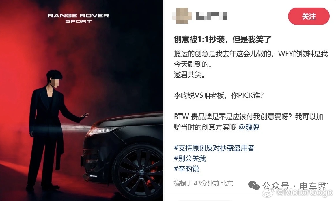 随后有网友指出,这张海报抄袭了自己为「路虎揽胜」拍的一张广告海报。图2