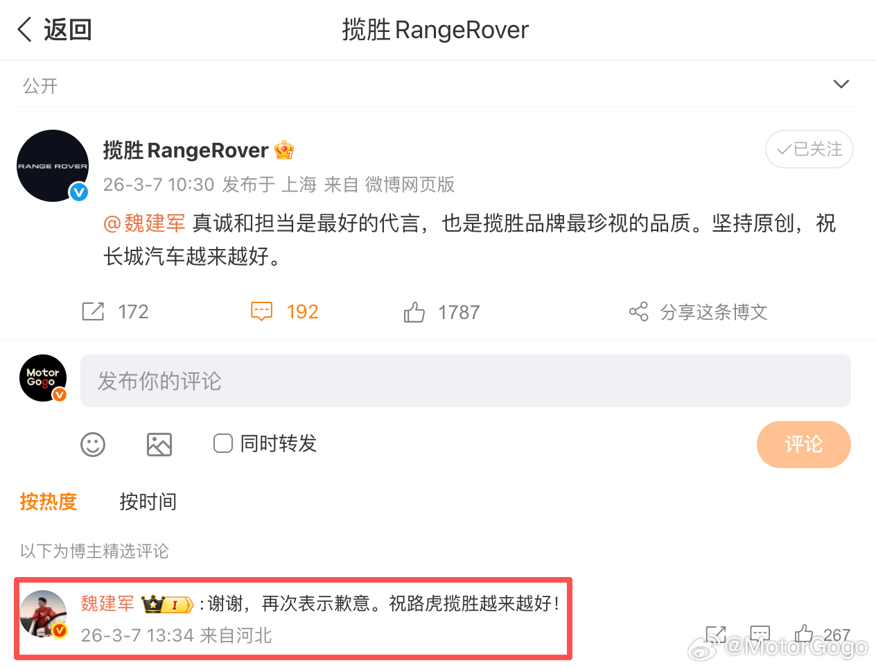 随后今天路虎揽胜官方微博也做了回应,并且魏建军也在评论区做了回复了。图4