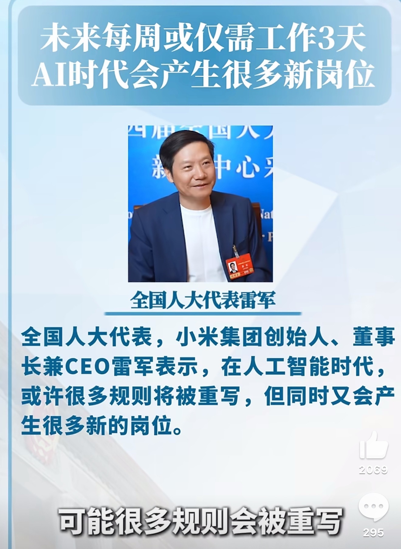 雷军说未来每周或仅需工作3天雷军这波预测让我挺振奋的。AI时代每周工作3天、每天2小时,这不是躺平,是技术解放生产力的终极形态。小米机器人已经进厂实践,5-10年迎来"机器人iPhone时刻",新岗位也会跟着冒出来。与其焦虑被替代,不如拥抱变化,提前布局技能升级。你怎么看?