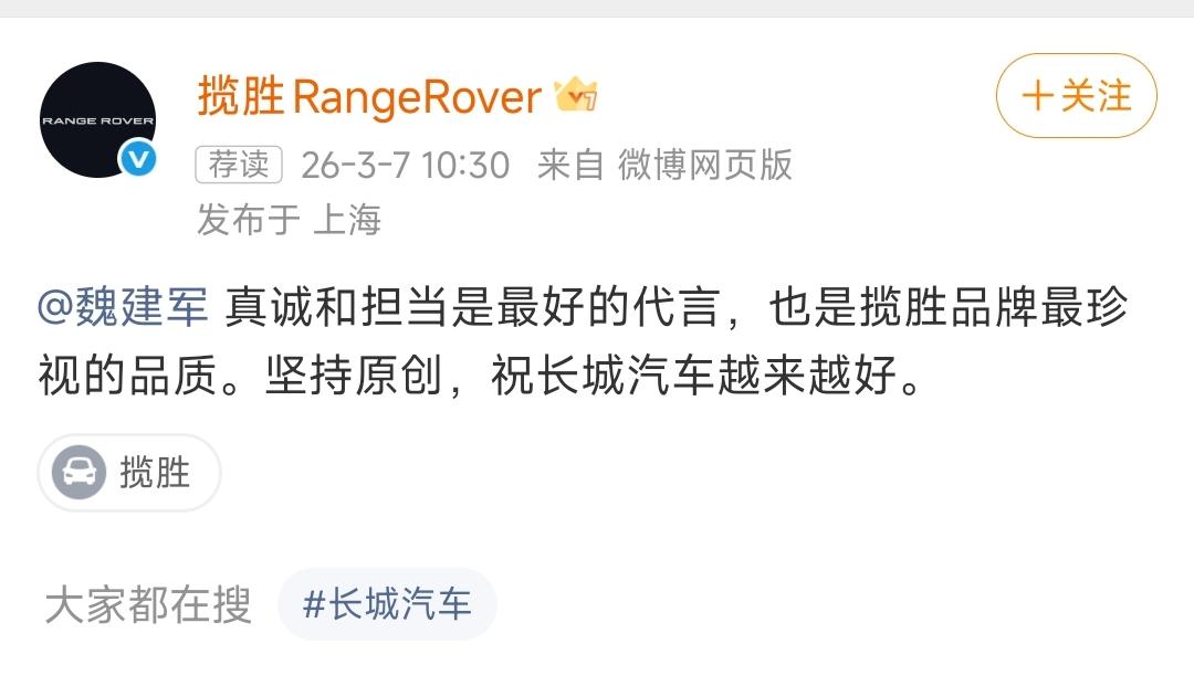 没想到魏牌旗舰suv就这么和揽胜互动上了,有人说老魏看似老实,一肚子花花肠子,其实魏建军做代言人还是第一次,被路虎揽胜祝福也是第一次,这是个直肠子的千亿老总,有错就改,就像路虎回复的: 真诚和担当是最好的代言,坚持原创,祝长城汽车越来越好。 互相致敬的车圈氛围是不是更好?