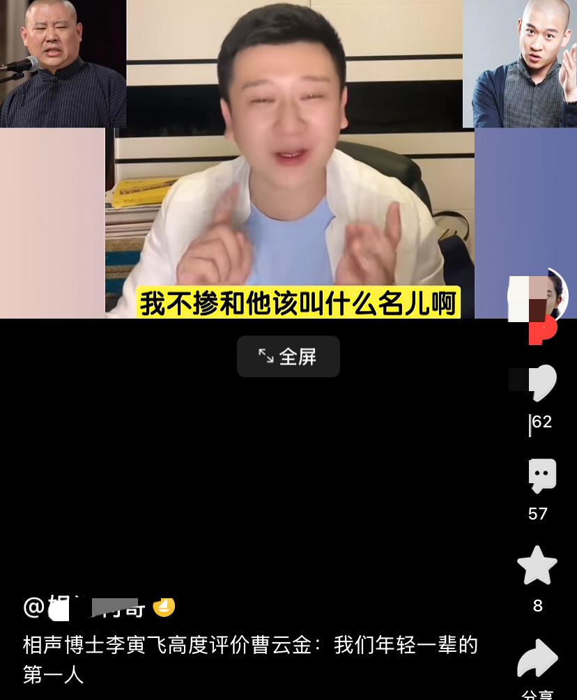 【著名相声演员李寅飞狠夸曹云金,直言同辈第一人,你怎么看?】 近日,著名相声演员、相声有新人全国20强选手、郭德纲原鹤字科弟子、大逗相声社班主、春晚常客李寅飞在直播的时候狠狠夸赞了曹云金,并且直言曹云金是同辈分当中的第一人,由此引发网友的关注!李寅飞此举就是把曹云金和岳云鹏、孟鹤堂、郭麒麟、金霏、李寅飞、陈印泉等同辈相声演员进行对比,把曹云金奉为第一人,其中的依旧是作品和基本功!对此,你怎么看? 第一,李寅飞此举有示好曹云金而膈应德云社的特点!众所周知,曹云金和郭德纲的是非,同时也知道曹云金和岳云鹏之间的争论,如今李寅飞刻意贬低自己而抬高曹云金,甚至奉为同辈第一人,这就是示好曹云金来报答结盟同台演出的情意,同时这样一来自然也就膈应德云社,让人觉得有些反感! 第二,李寅飞的评价标准是从台上的业务和台下的做人,这点就是有待商榷了!都说曹云金是得到郭德纲真传的,但是曹云金本人却否认声称自己是带艺投师的!其实,你会发现曹云金的商演上座率不高,粉丝基础、国民识别度等等都不如岳云鹏,加上他的作品重复率很高,这样的业务奉为第一人确实有些意外;台下做人更是一言难尽,和郭德纲的论战更是成为抹不掉的话题,这样的状况成为第一人确实意外!