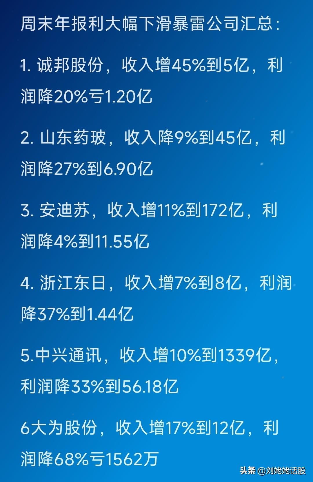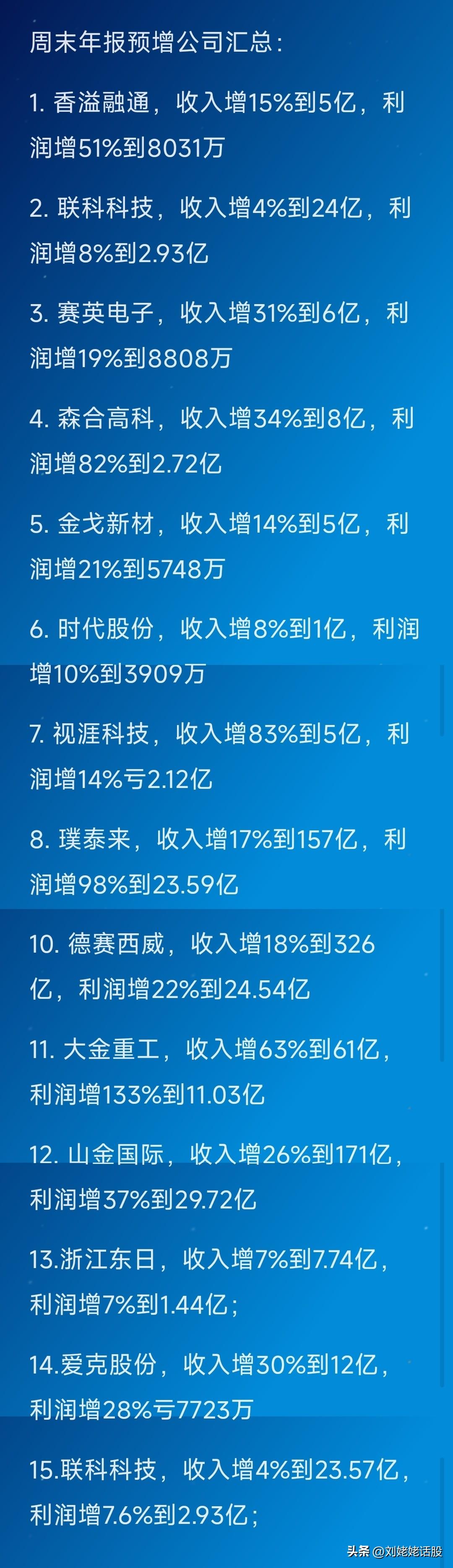 周末“年报业绩”预告汇总! 大幅预增公司14家…… 大幅下滑暴雷公司6家…… 关注“刘姥姥”,精彩分享真不少(麻烦亲们:点赞,收藏,分享)。 特别提醒:本文涉及内容及个股,仅供交流与参考,不是荐股,不得以此作为买卖依据,盈亏自负。