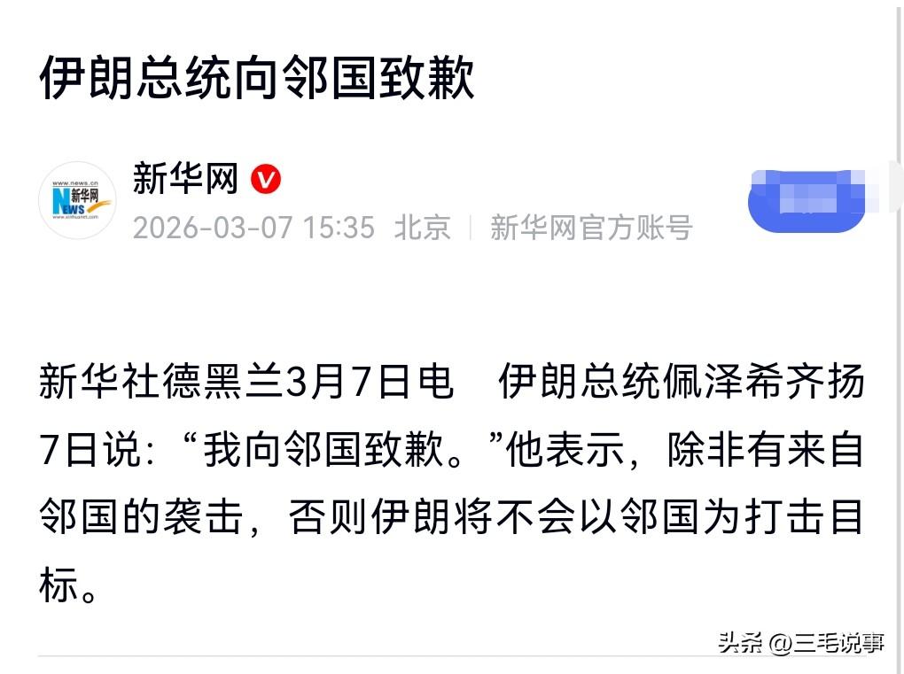 这个道歉是很必要的,能够缓解国与国之间紧张的关系。 3月7日热搜,伊朗总统向邻国致歉。 他说除非有来自邻国的袭击,否则伊朗将不会以邻国为打击目标。 这确实是个红线,要是得罪了这些邻国,一起来攻打伊朗就麻烦了。 伊朗合理的自卫,那当然是允许的。