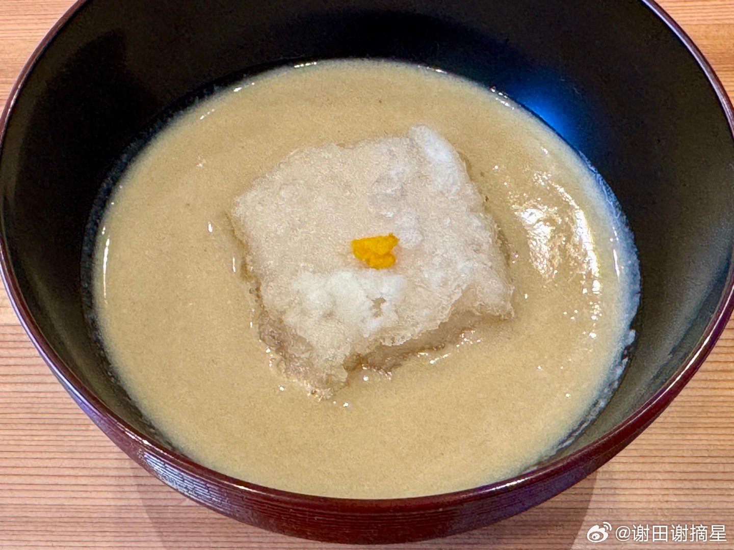 之后是图1主菜熊掌,这是日式的清汤熊掌,毫无异味,清香淡雅,入口即化。吃起来会有一点像猪蹄,但是肉质有差异。其实大多数店做的熊掌并不好吃,主要是去腥的处理周期太长了,可能要七天左右,功夫不到就不好吃,但是这家店的熊掌毫无问题,只剩下了好吃的肉质感。