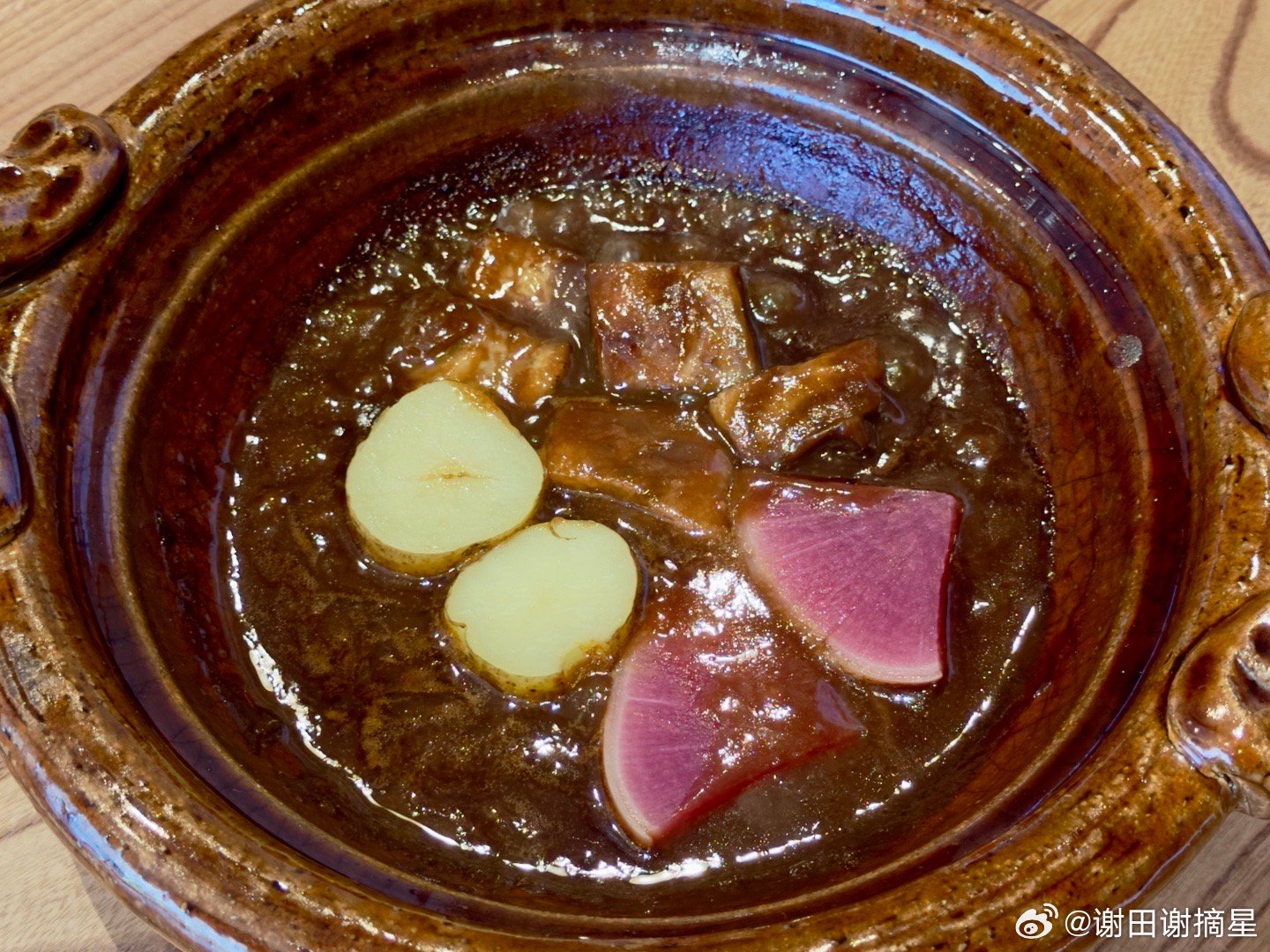 图7是长野风格的野猪苹果烧饼,吃起来有点像包子,里面的苹果和野猪肉是绝配,一吃一口油,太香了。图8是熊肉汉堡和牛蒡干,熊肉味道不错,底下是柚子酱汁。图9是红烧野猪肉、配一年熟成土豆和红心萝卜,野猪肉香甜可口,土豆和萝卜都很香糯。