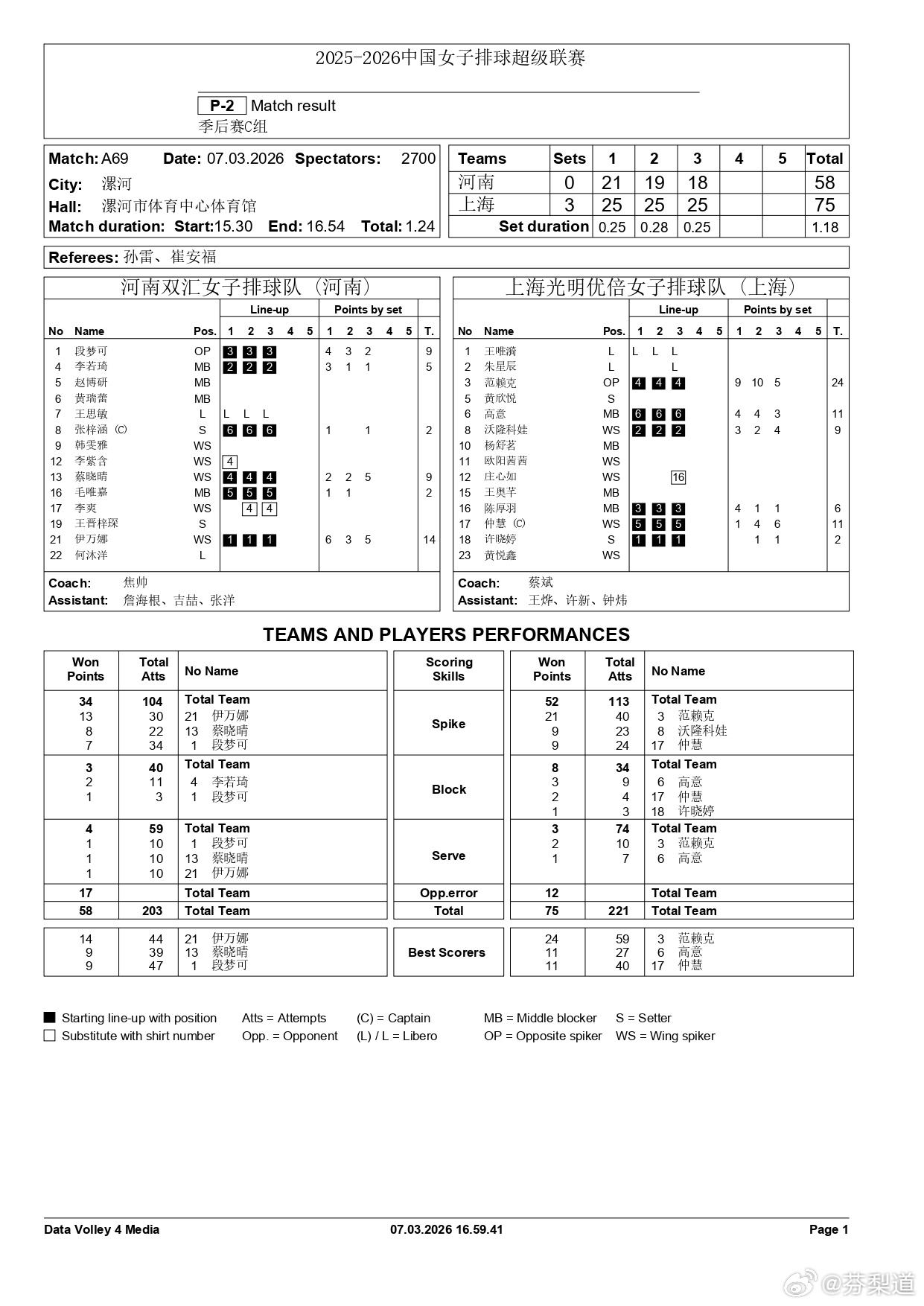 排超联赛2025-2026中国排球超级联赛河南双汇主场0-3(21-25/19-25/18-25)上海光明优倍,韩雯雅和黄瑞蕾为啥都不上?马上启程去越南的歌星9分范赖克24分 40扣21中1失误1被拦 2发1拦
