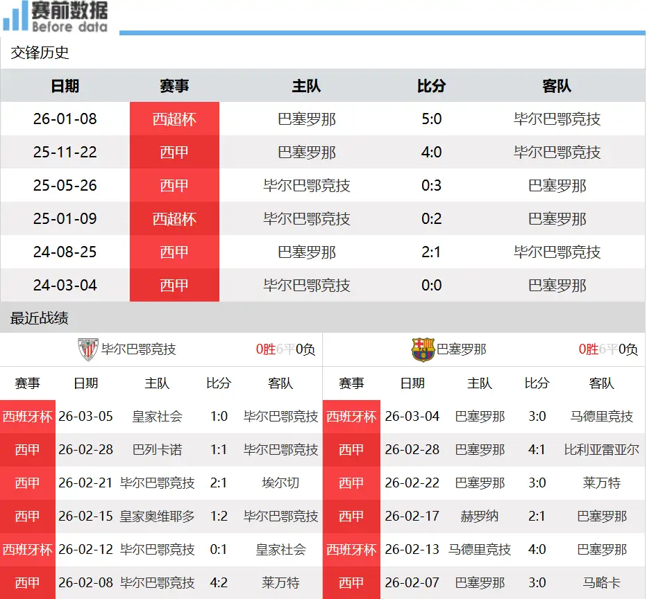 毕尔巴鄂竞技vs巴萨前瞻:巴萨防线受损,客场强攻力争登顶稳固北京时间3月8日凌晨4时,西甲第27轮迎来强强对话,毕尔巴鄂竞技主场迎战巴萨。毕尔巴鄂竞技vs巴萨,比赛看点如下:第一:两队积分形势!西甲26轮结束,毕尔巴鄂竞技10胜5平11负积35分排名第九,距离欧战区只差1分;巴萨21胜1平4负积64分排名第一,仅领先皇马1分。上轮联赛,毕尔巴鄂竞技客场1-1战平巴列卡诺,联赛五轮不败,周中国王杯不敌皇家社会出局;巴萨主场4-1大胜比利亚雷亚尔,联赛两连胜,周中国王杯3-0战胜马竞却因总比分被淘汰。第二:巴萨后防线伤病严重,客场以攻代守全力拿三分!毕尔巴鄂竞技近期状态稳定,但整体成绩一般。巴萨为了冲击国王杯决赛拼尽全力,虽然大胜马竞,却让两名主力后卫受伤离场,防线隐患巨大。本场客场,巴萨只能依靠进攻弥补防守漏洞,佩德里掌控中场节奏,球队目标明确就是客场三分。两队均是一周双赛,巴萨阵容厚度更占优,本场看好巴萨客场取胜。双方近6次交手,毕尔巴鄂竞技1平5负,处于绝对劣势。双方伤停情况:毕尔巴鄂竞技有埃吉卢斯、普拉多斯、尼科、桑纳迪;巴萨有克里斯滕森、巴尔德、孔德、加维、德容。毕尔巴鄂竞技vs巴萨