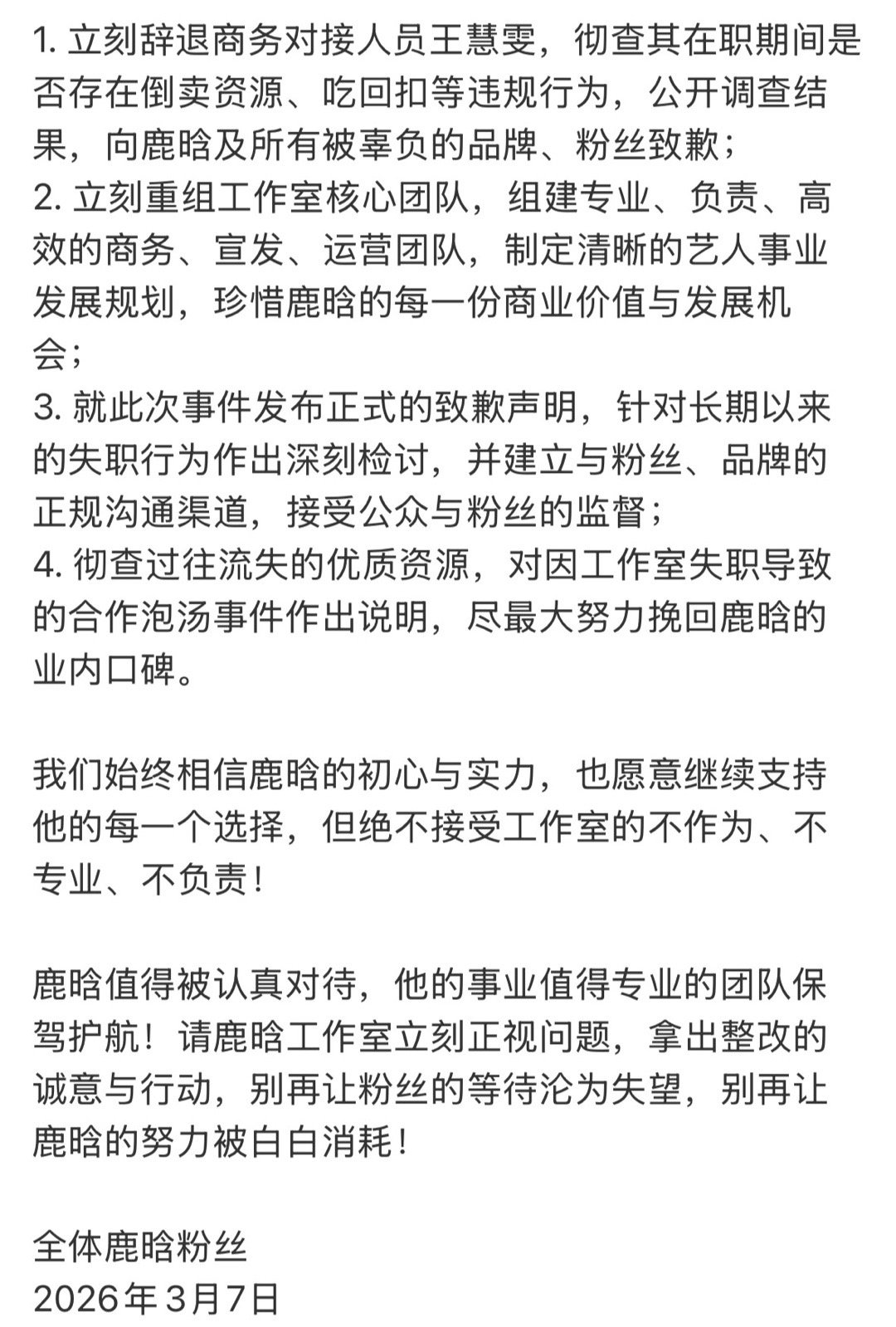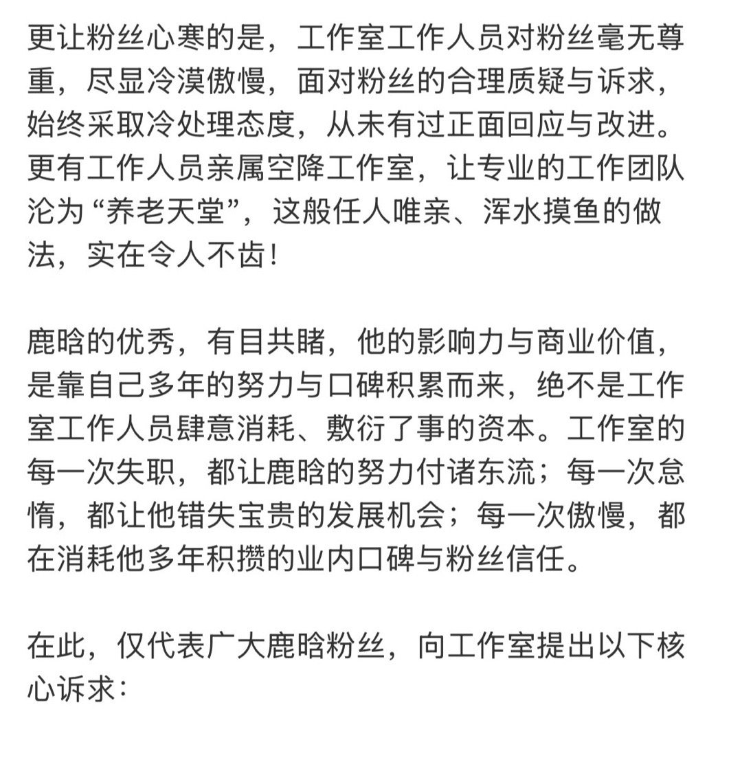 鹿晗粉丝致鹿晗工作室的一封信鹿晗工作室回应粉丝诉求