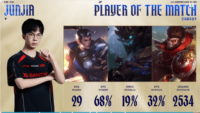 大鹏一日同风起!Junjia发挥出色拿到JDG对阵WBG比赛大场MVP